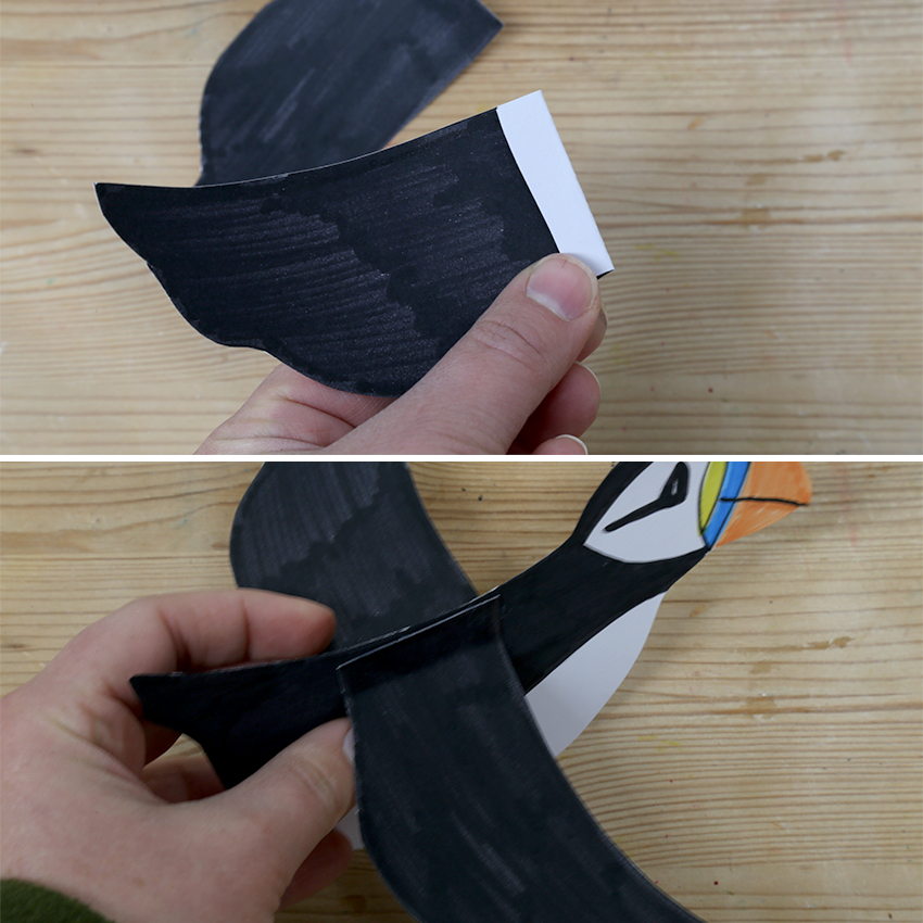 • Step 5Take the thin strip of folded cardboard and glue the open ends to either side of the puffin’s body. Allow to dry.