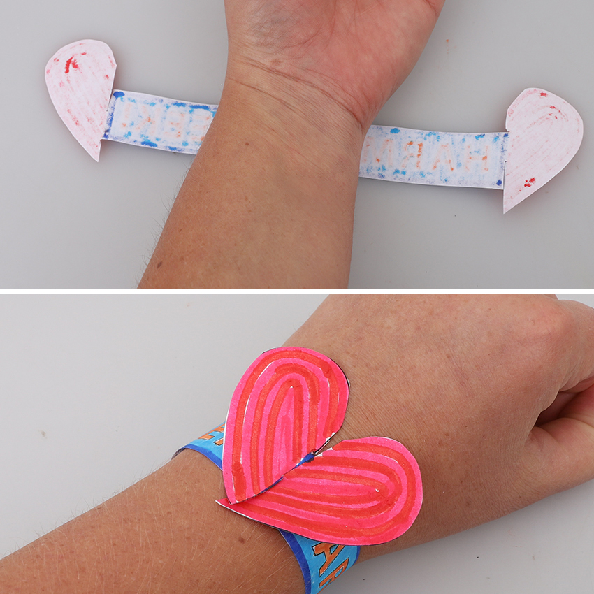• Step 4Your Paper Bracelet is now ready to wear or gift! Choose the design you want to wear and then flip the bracelet so the plain side is facing up. Place your wrist on top. Pull the end pieces up around your wrist and slot together using the slits you cut in Step 3. You might need to ask a friend or family member to help with this.
