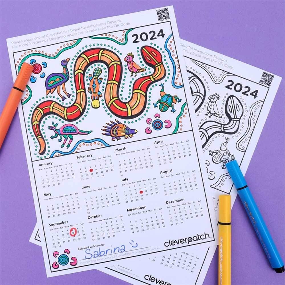 Get ready for 2024 by colouring in this beautiful calendar created by Aboriginal Artist Belle Leonard! Children will be able to decorate their calendar, then gift or use it throughout the year!