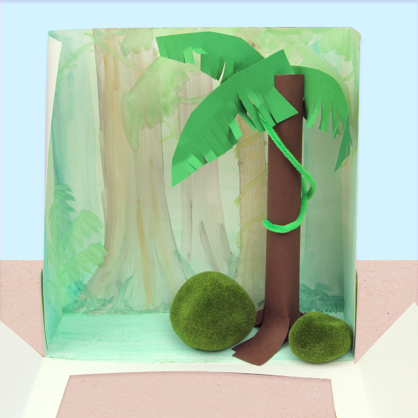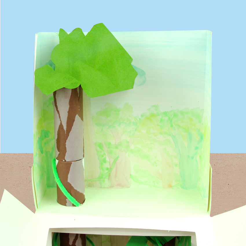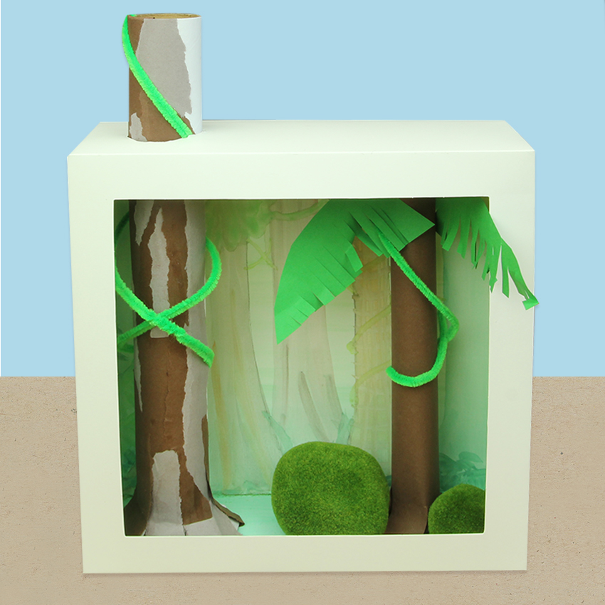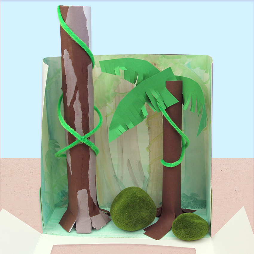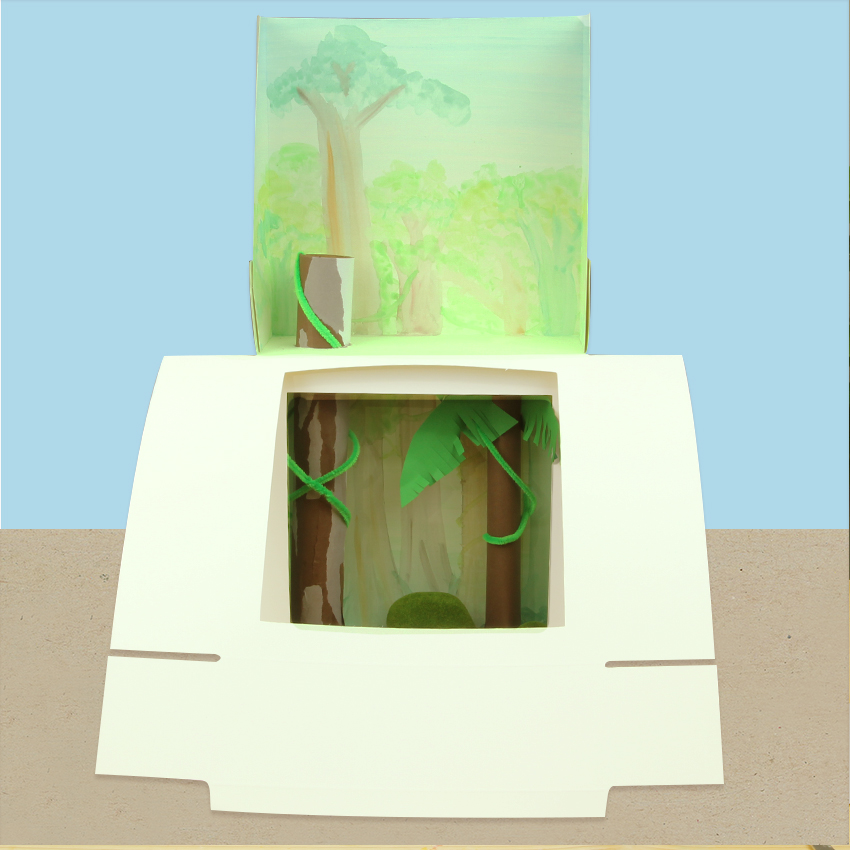• Step 2Start with the lower box that will contain the forest floor and understory. Fold along all the score lines of the box. Half assemble your box, so the back wall is standing up with the front still down. This means you can start placing items inside your box. Use glue to secure the tabs to the outside of the box. Start building pieces of your rainforest using collage materials. We have created a young sapling tree from cover paper for the understory, then added in some imitation moss rocks and chenille stem vines. Use glue to secure any pieces you have added. Allow to dry.