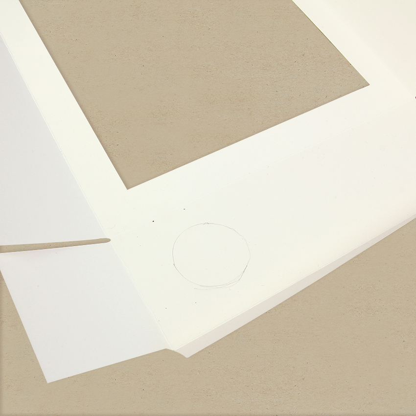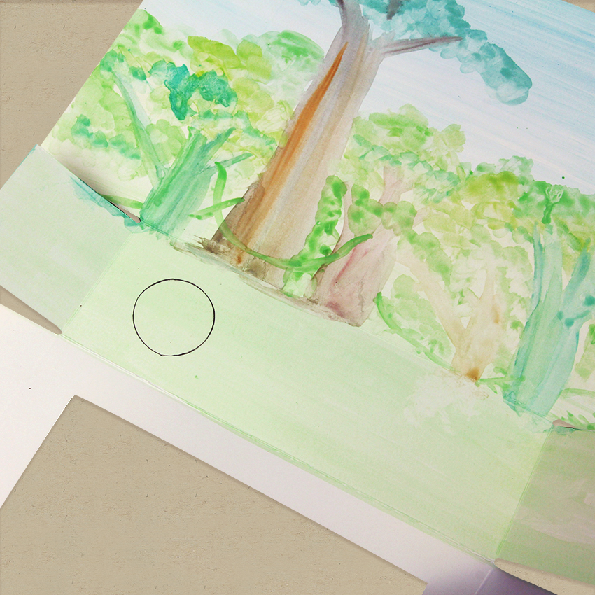 • Step 6The emergent tree also has to go through the bottom of the 2nd shadow box. Use a pencil to trace around a cardboard roll on the bottom flap of the box where it will sit. Use scissors to carefully cut the circle out.