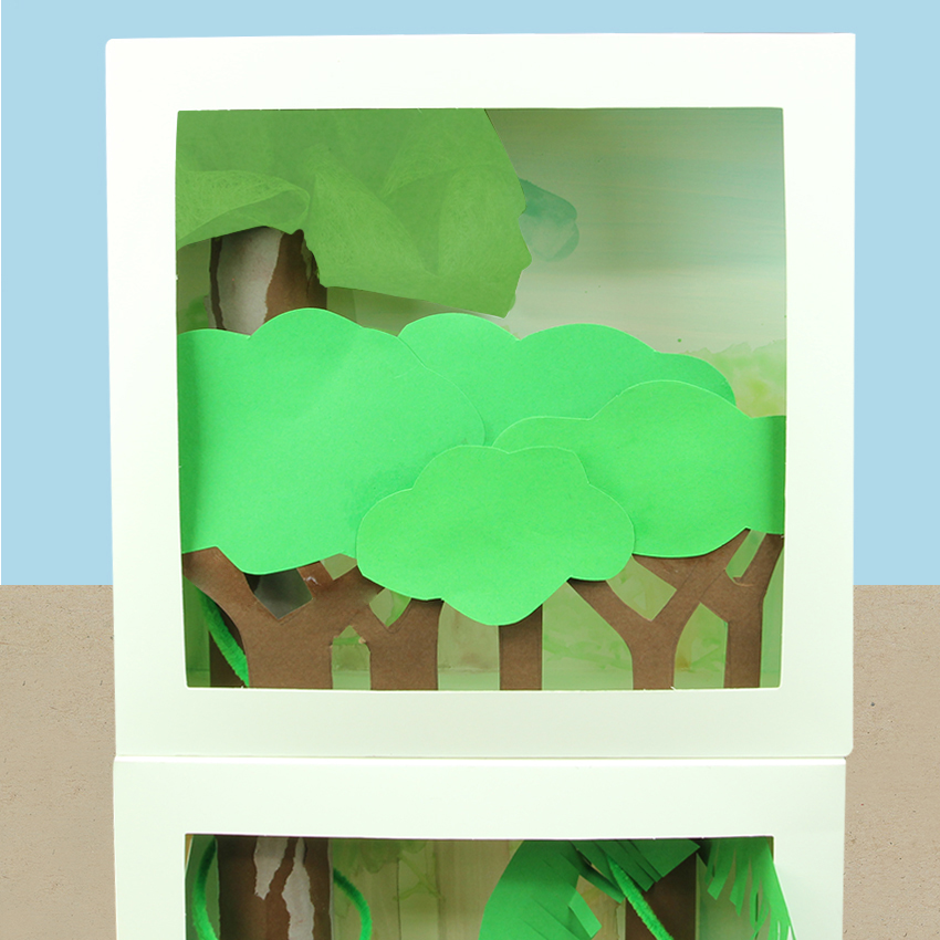 • Step 9Assemble the rest of the top shadow box and then create the canopy using cover paper. Cut some treetops from green paper and tree trunks from brown paper. Layer and glue them in place towards the front of the shadow box as shown.