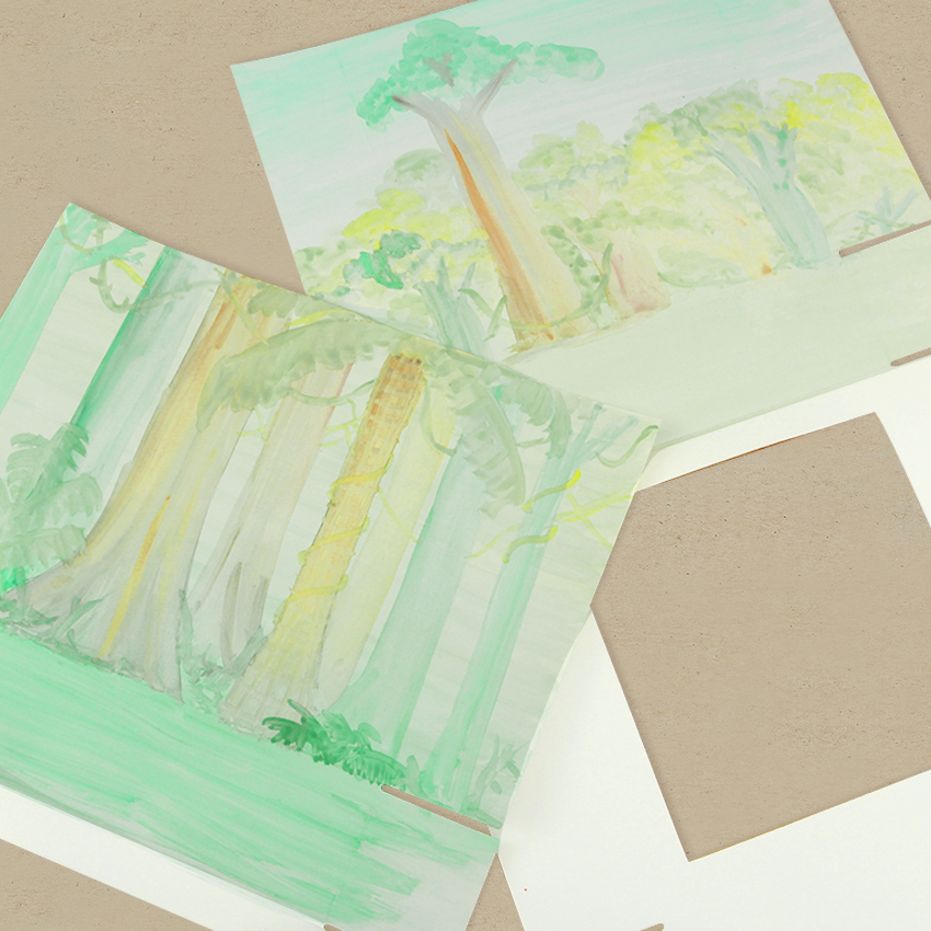 • Step 1Take 2 shadow boxes and while flat, decorate the back panels to create a rainforest using watercolour paints. Remember there will be 2 layers of the rainforest in each box, so you will need to show the forest floor and understory in one, and then the canopy and emergent layer in the other. You will also need to ensure your background design lines up across the 2 boxes. This will create a great background for your diorama. Allow to dry.