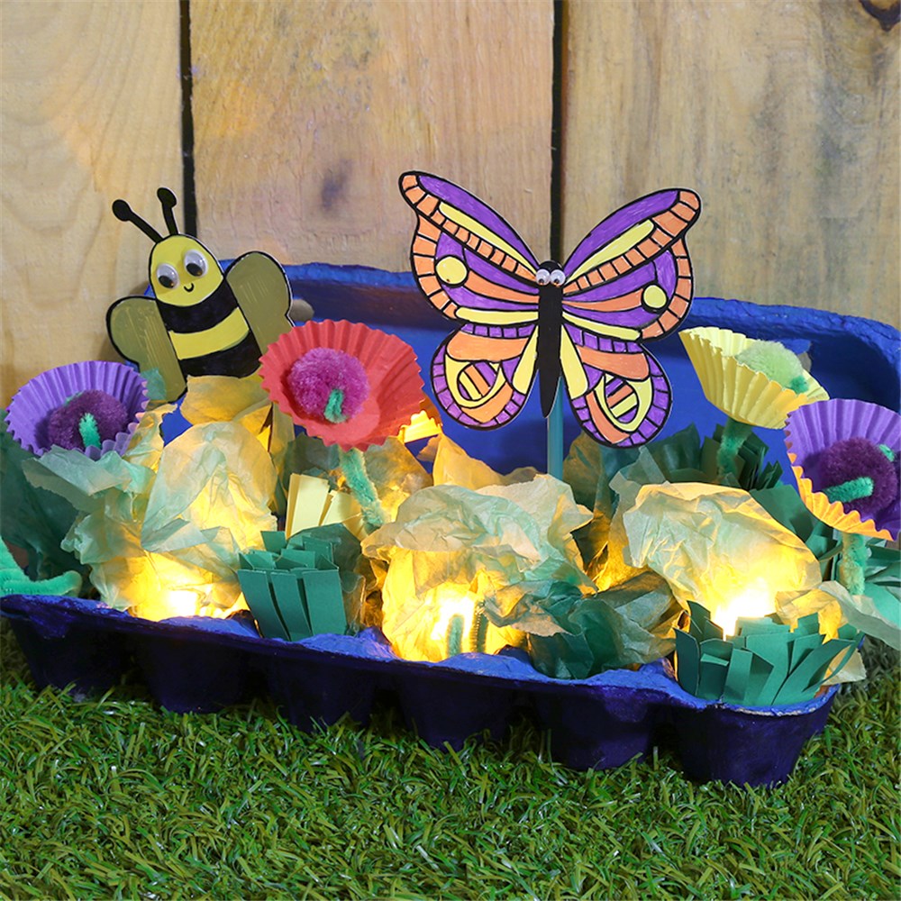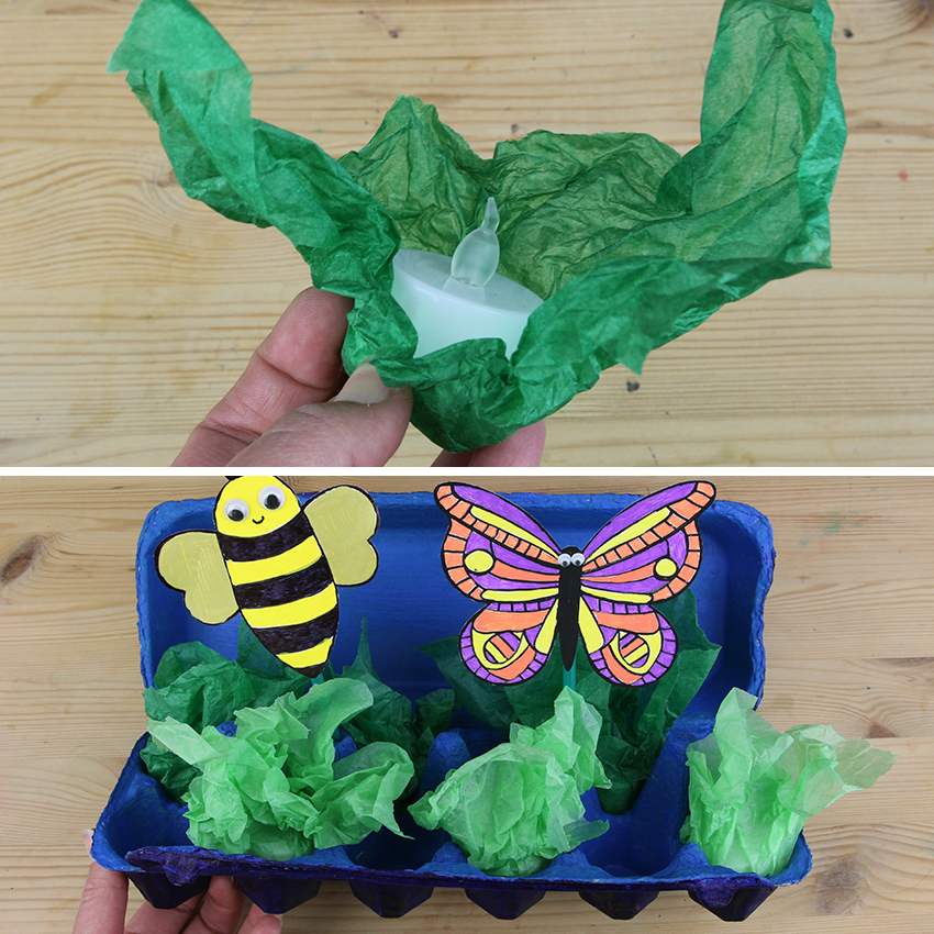 • Step 8Place the flowers into the egg carton to complete your garden! Admire your beautiful garden all day and then once the sun goes down you can flick on the tealights to watch your garden glow!