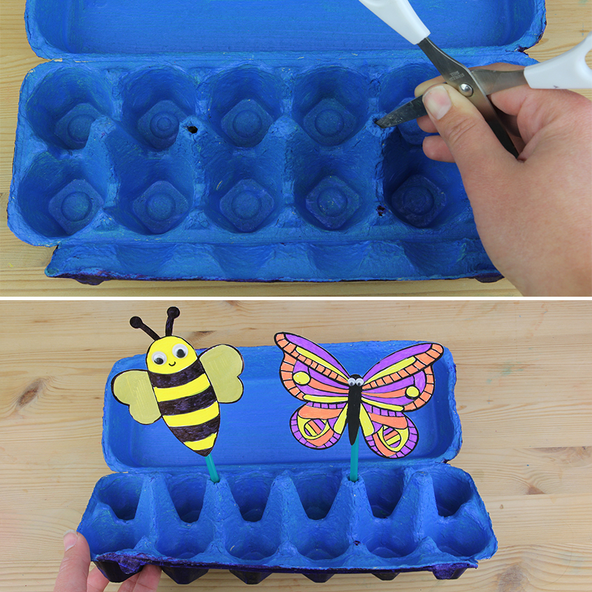 • Step 3Use scissors to carefully create holes in 2 of the pointed parts of the egg carton as shown. Adult supervision is recommended when using scissors. Push the straws of the minibeasts from step 2 into the holes you have created. Trim the bottom of the straws if needed.