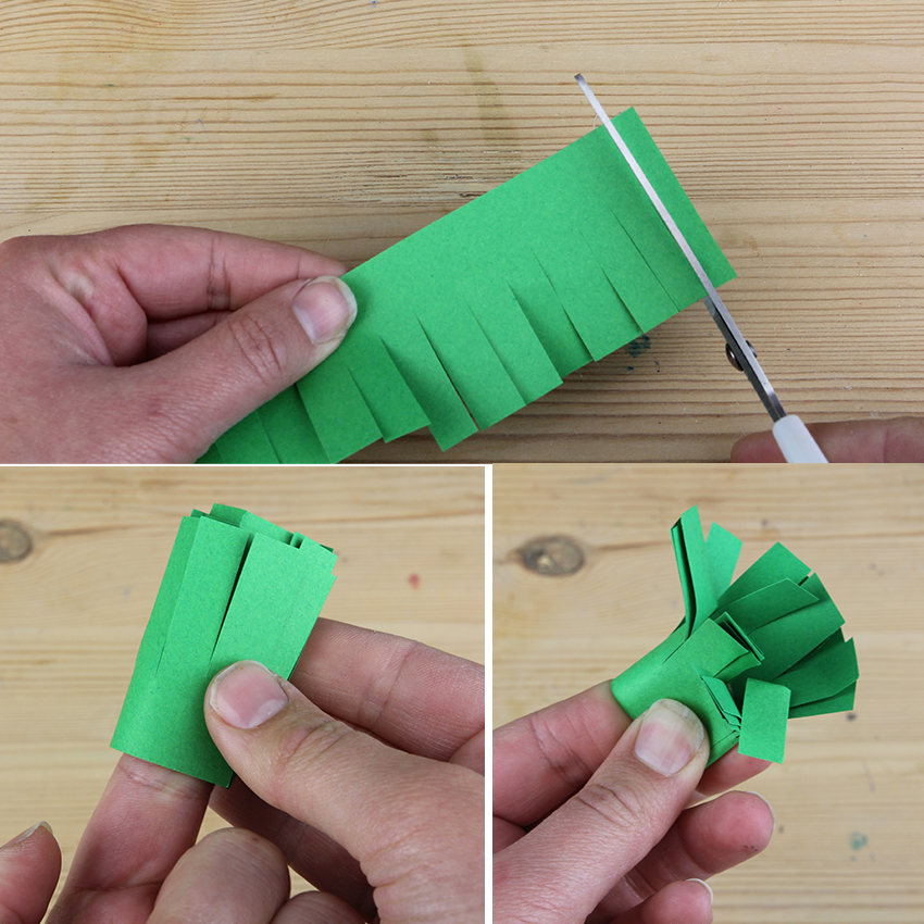 • Step 5To create some different textures in your garden, cut strips of cover paper then cut a fringe along one edge. Roll the paper strip around your finger and use your fingers to rough up the fringing. You may need to use some glue to hold in place. Create more fringed grass using different sized strips of paper and you can even include different colours.