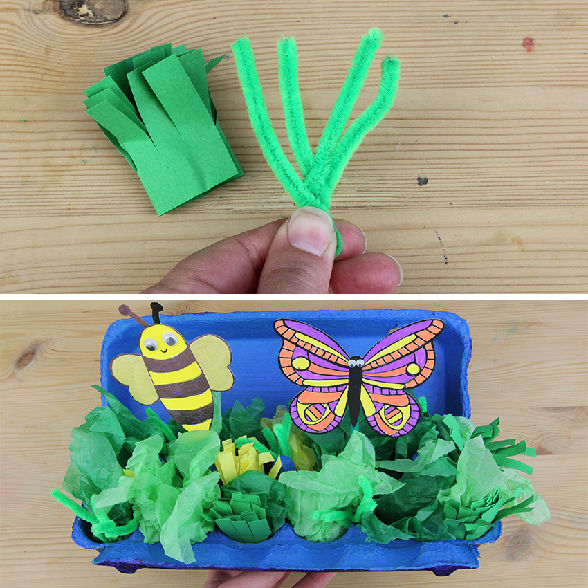 • Step 6Add even more grass-like textures using green chenille stems. Fold in half, then half again. Use scissors to cut the looped end and then twist the strands together. Once you have a variety of grass textures, place them into the egg carton, filling up the remaining wells.