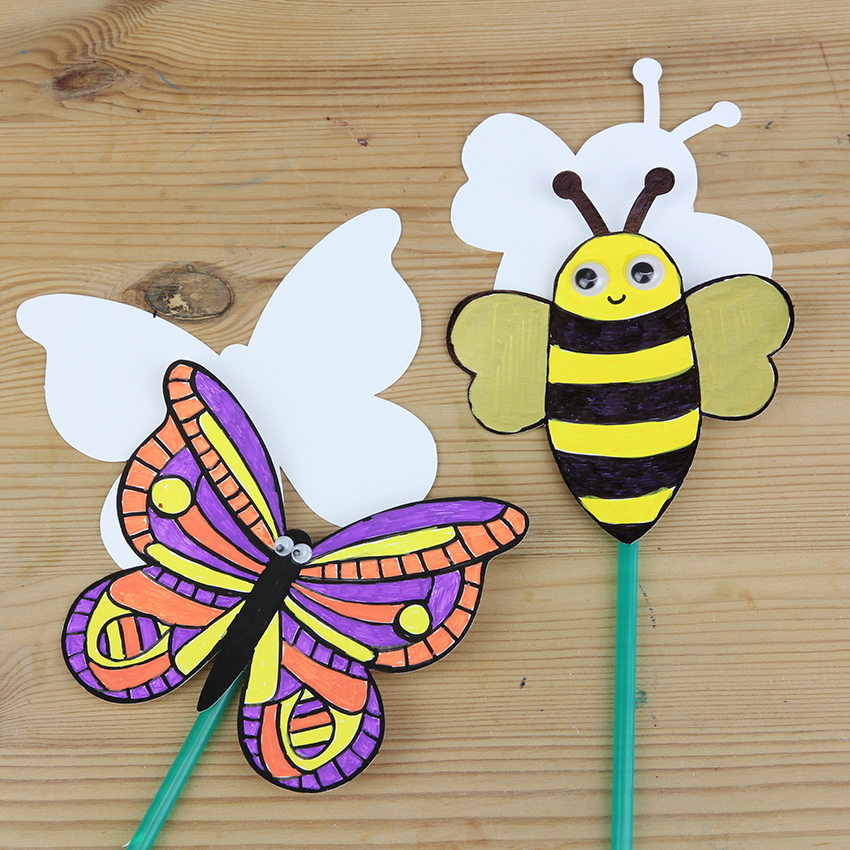 • Step 2Print out the minibeast templates provided onto white cover paper and decorate using your favourite craft materials. We have chosen to use POSCA Markers and wiggle eyes. Allow to dry if needed then attach a straw to the back of each minibeast using sticky tape.