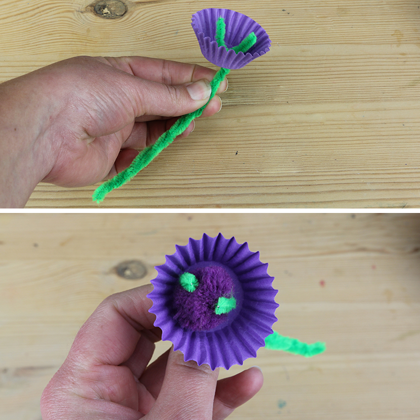 • Step 7Take a green chenille stem and fold in half. Twist the lengths together from the bottom leaving approximately 2cm at the top. Push these ends through the bottom of a patty pan as shown, then use the chenille stem ends to hold a pom pom in the centre to create a flower. Repeat this step a few more times to create more flowers for your garden.
