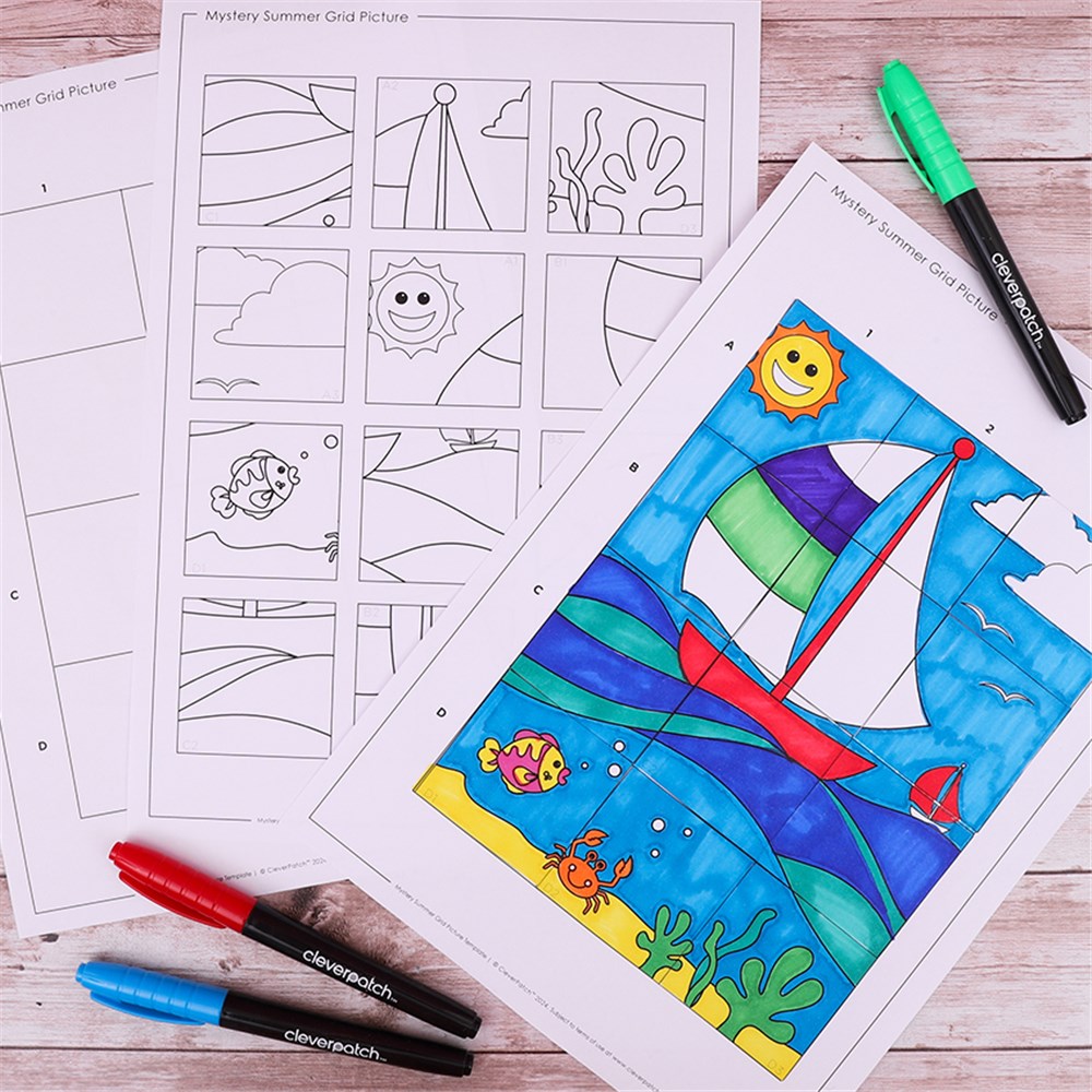 Use your grid reading skills to arrange the summer scene pieces, then add colour!