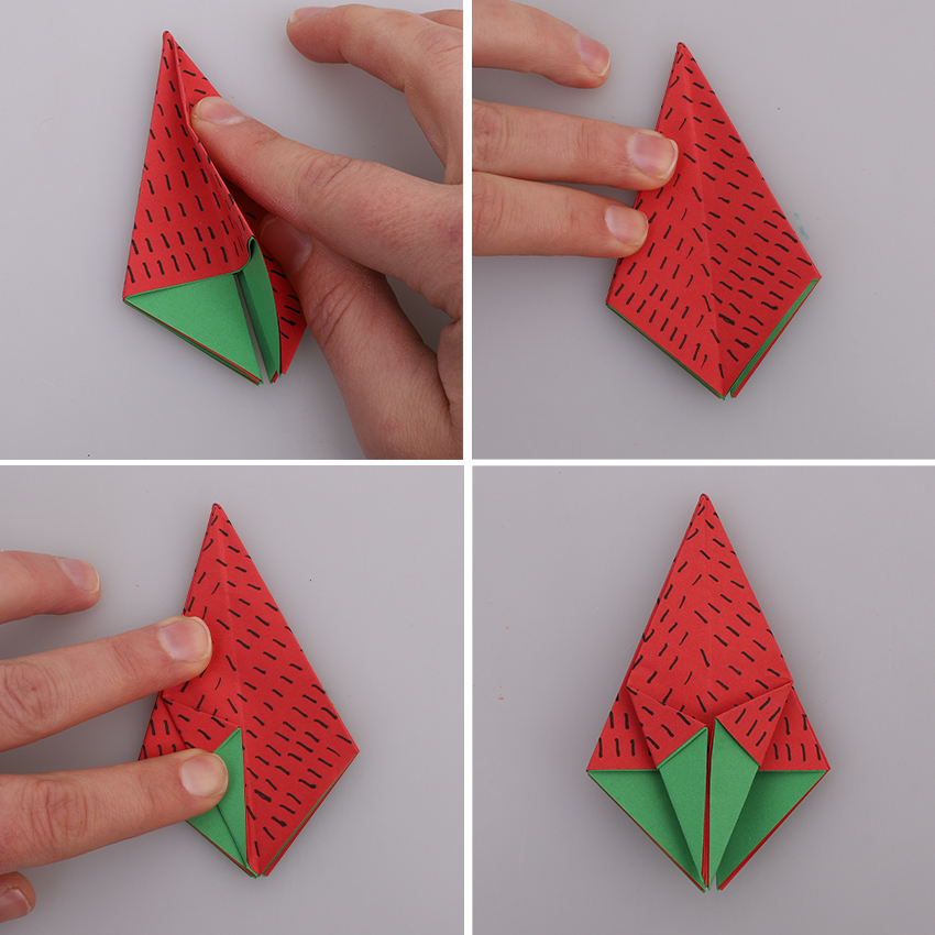 • Step 17Fold two flaps on the right-hand side over to the left to reveal another green point at the top. Fold the top point downwards.