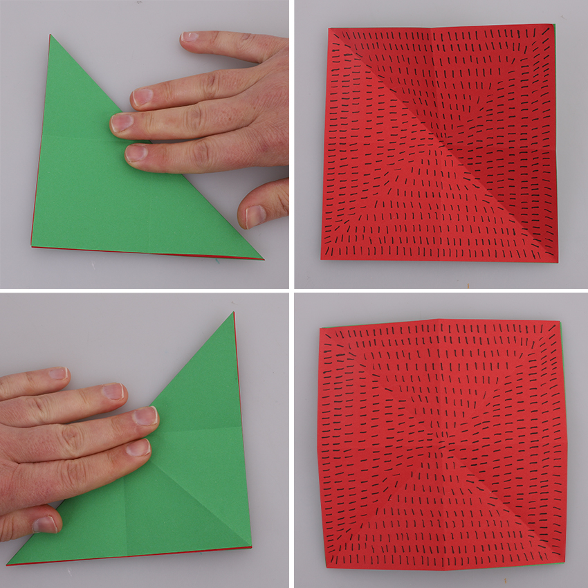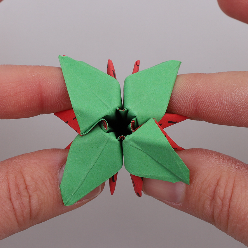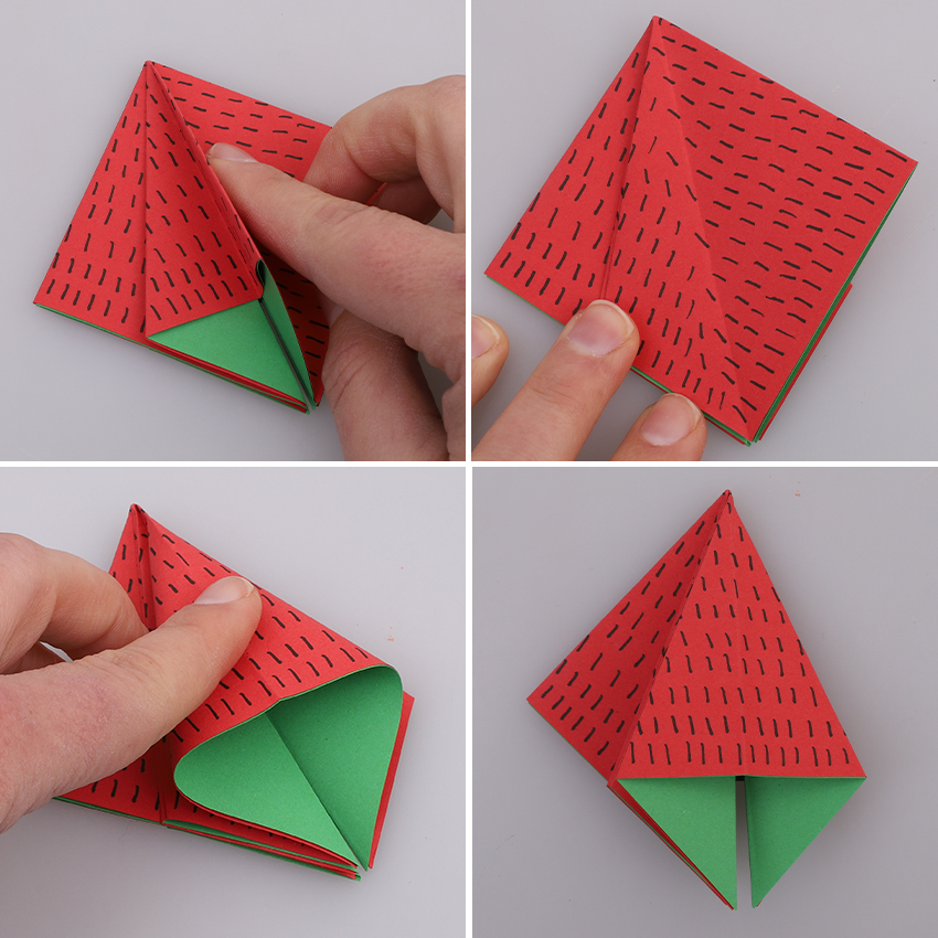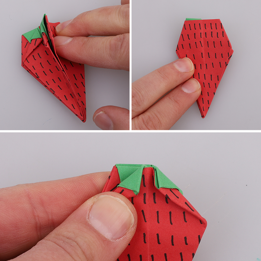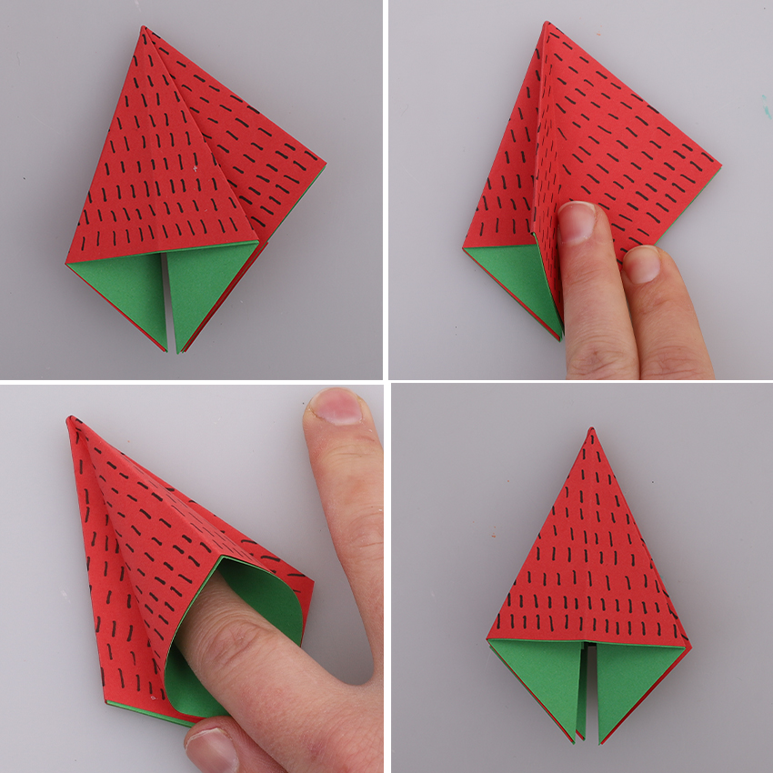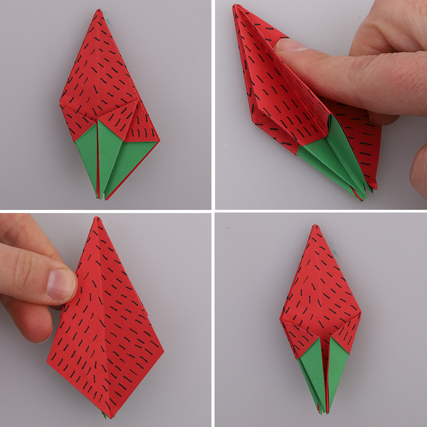 • Step 23Pick up the paper and hold in your fingers as shown, pushing the green points upwards. You should see a small opening at the top.