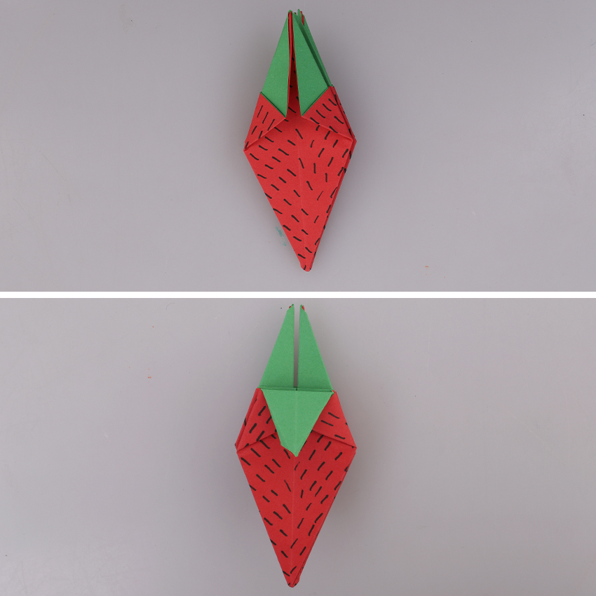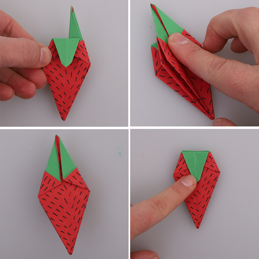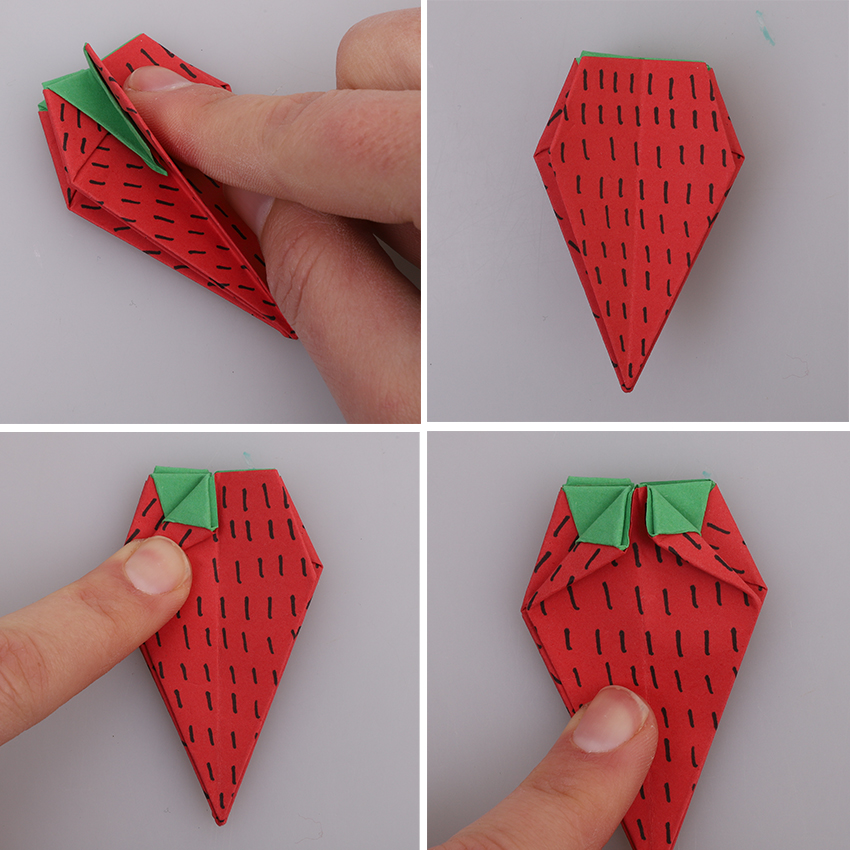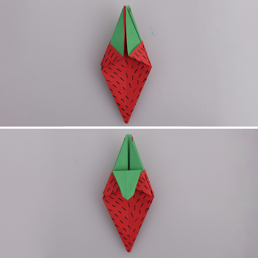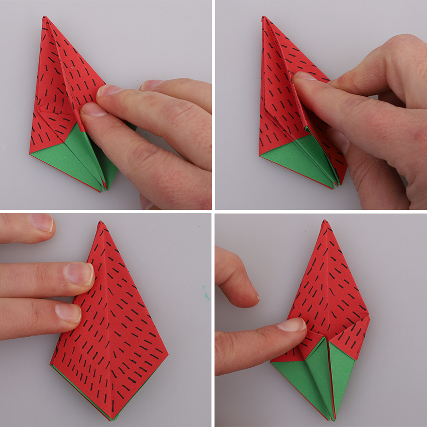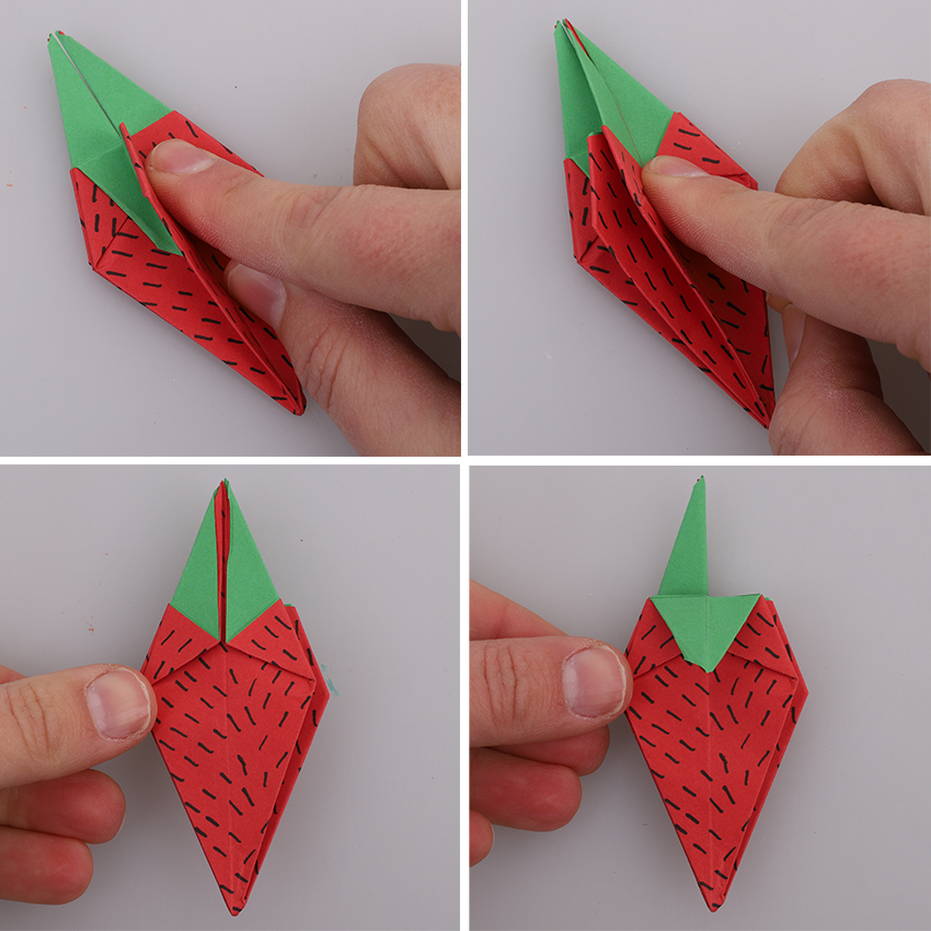 • Step 15Spin the shape 180 degrees so the green point is at the top. Fold the top point downwards as shown.