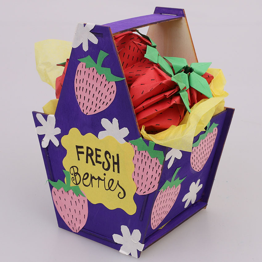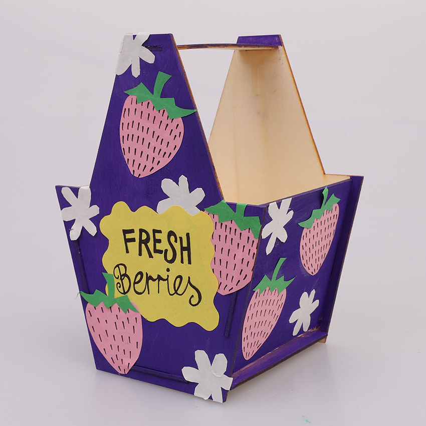 • Step 25Assemble a wooden basket using glue, then allow to dry. Decorate your basket however you wish. We’ve painted with a solid colour, then cut out strawberry and flower shapes from matt paper squares and glued them in place before adding details with a permanent pen. Adult supervision is recommended when using scissors.