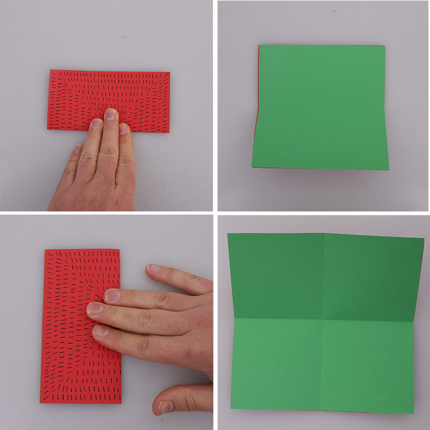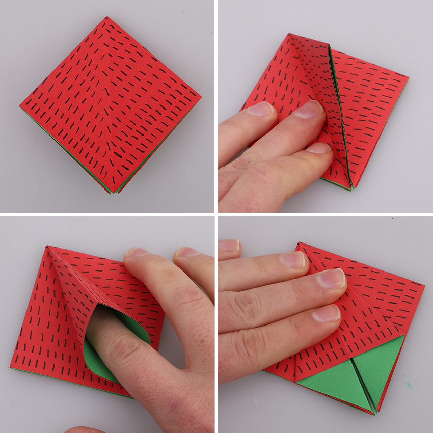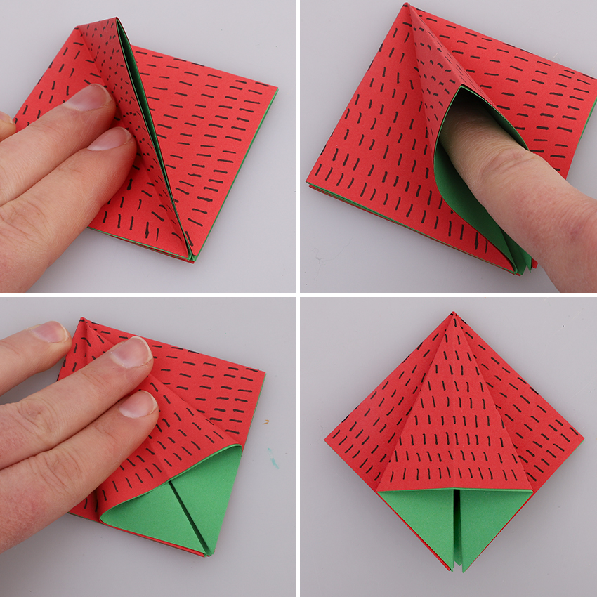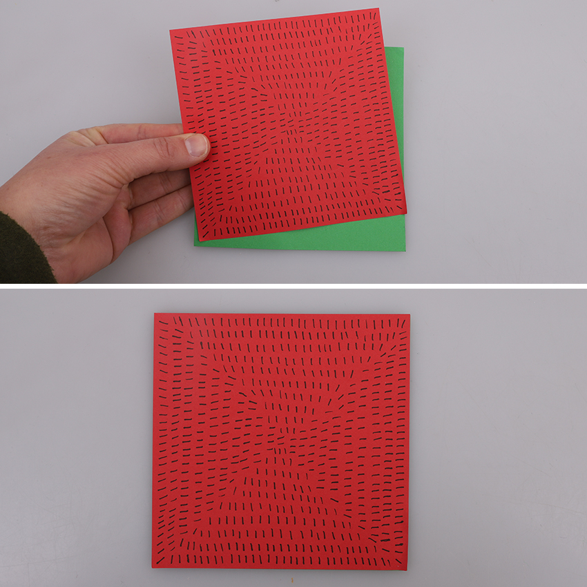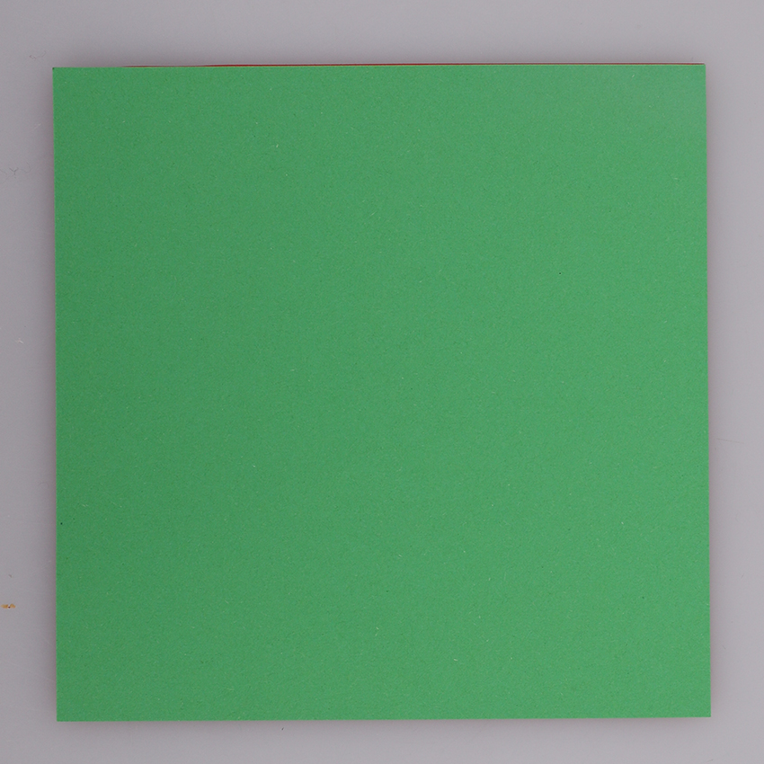 • Step 2Take a green paper square and lay the red square on top of it with the ‘seed’ side facing upwards. We’re going to be working with the two sheets of paper together like this, so make sure the edges are all lined up nicely.