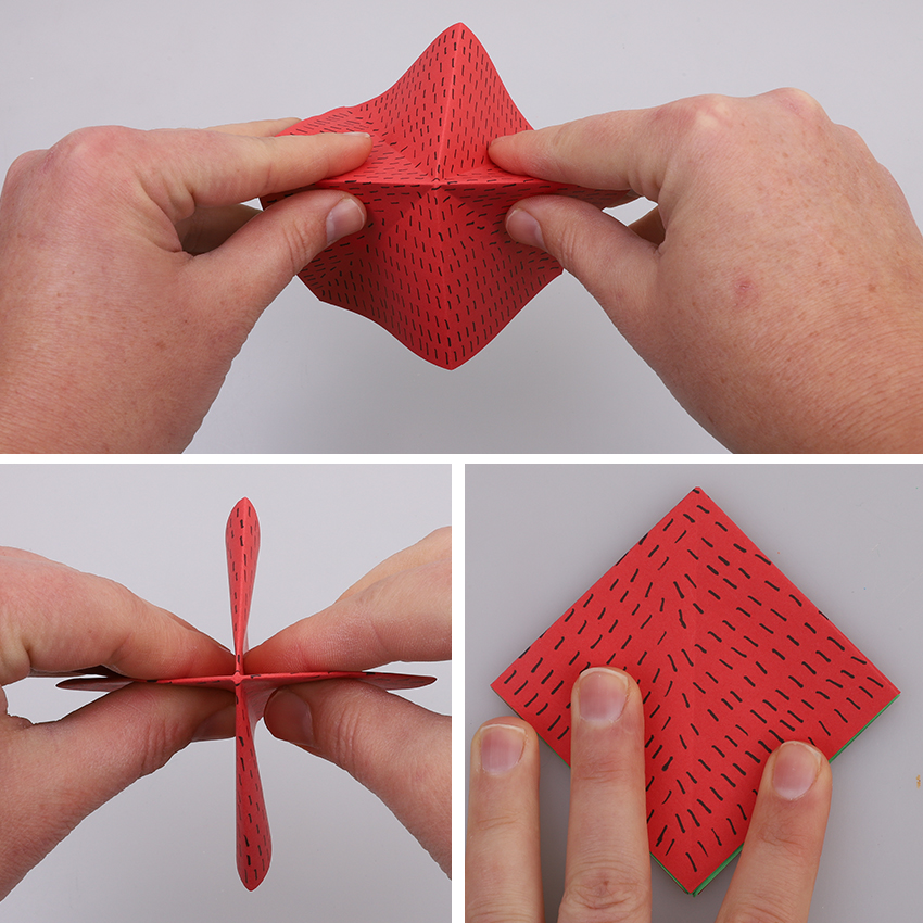• Step 6Pick up the paper and guide it into a diamond shape, letting the paper fold naturally along the lines you have already created. The diagonal lines should valley fold inwards and the others mountain fold outwards. Pinch together then fold flat into a diamond as shown, with the open end at the bottom.
