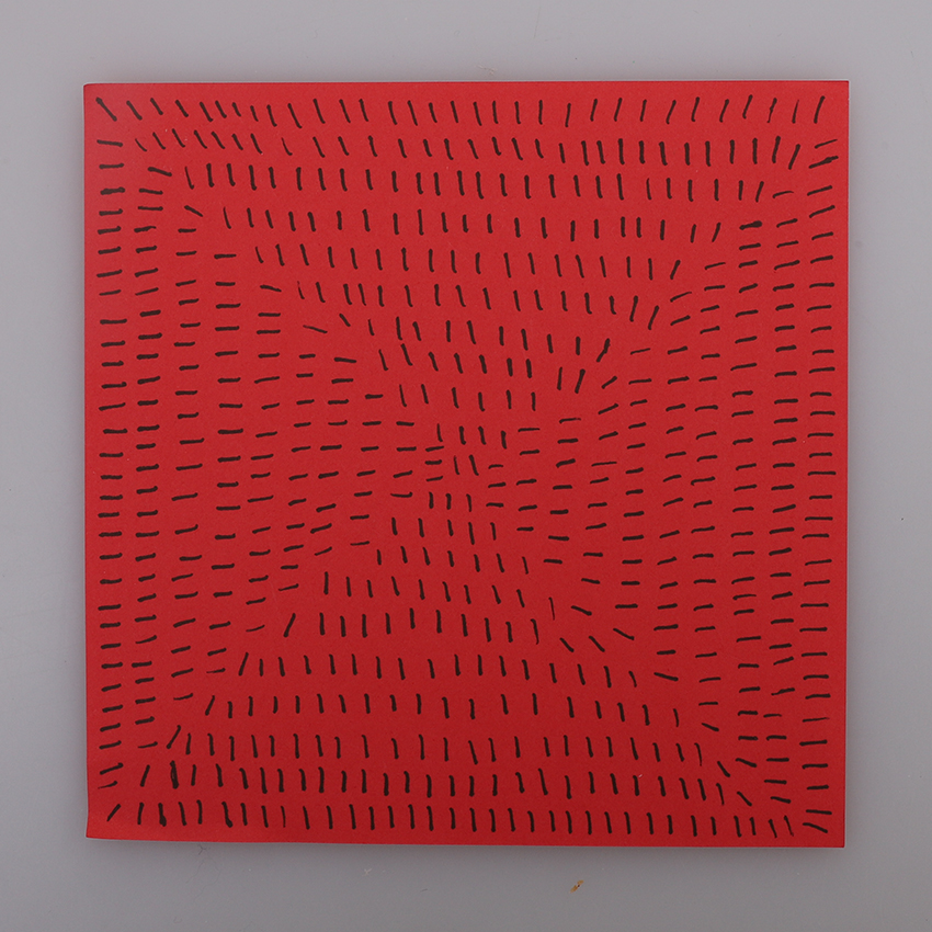 • Step 1Take a red paper square and cover one side with small black strokes. These will be the seeds of the strawberry.