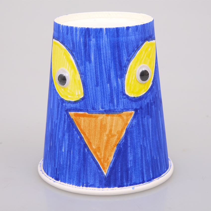 • Step 3Turn your paper cup upside-down and decorate using markers. Draw a beak and shapes around where the eyes will sit. Glue on two wiggle eyes and allow to dry.