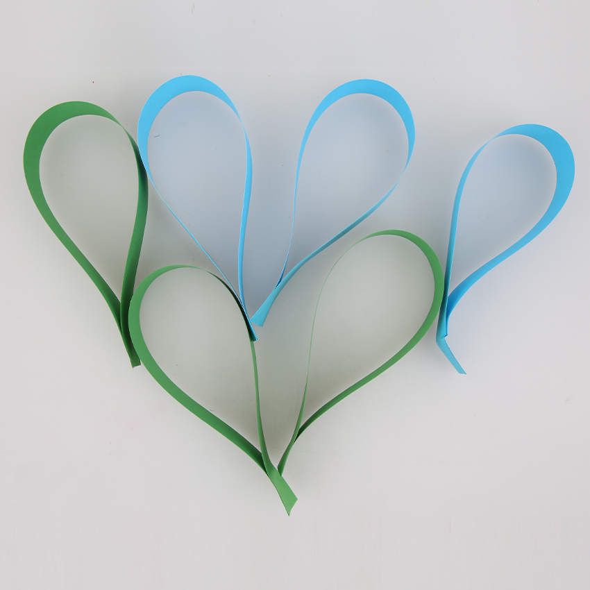 • Step 1Cut 3 strips each of green and blue paper measuring 3cm wide along the long edge. Adult supervision is recommended when using scissors. Bring the ends of each strip together to create a loop and glue in place. Allow to dry.
