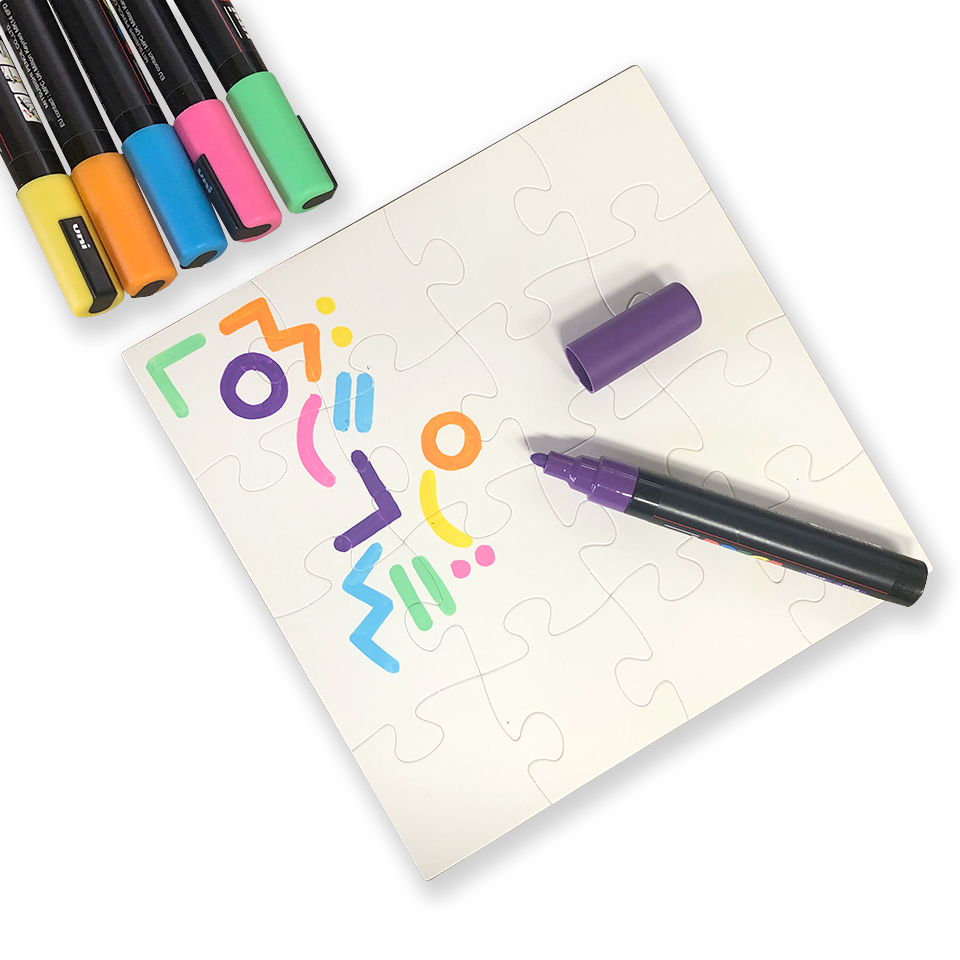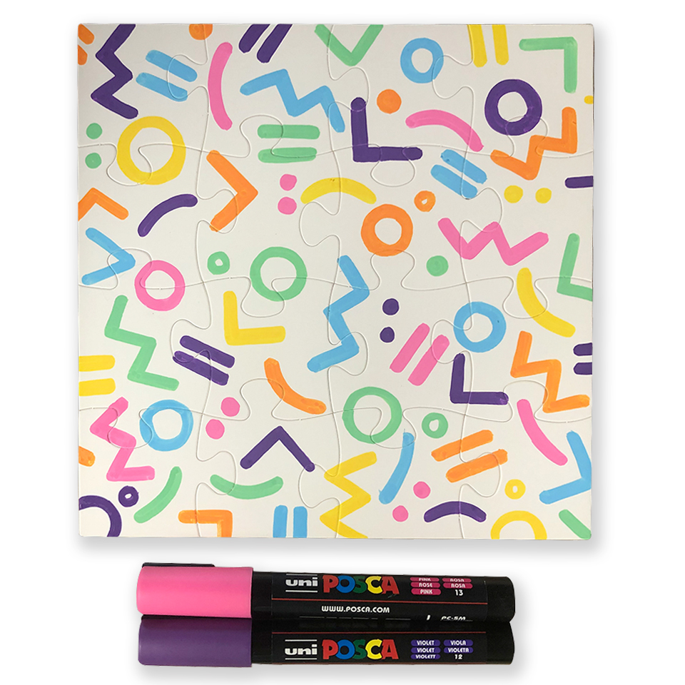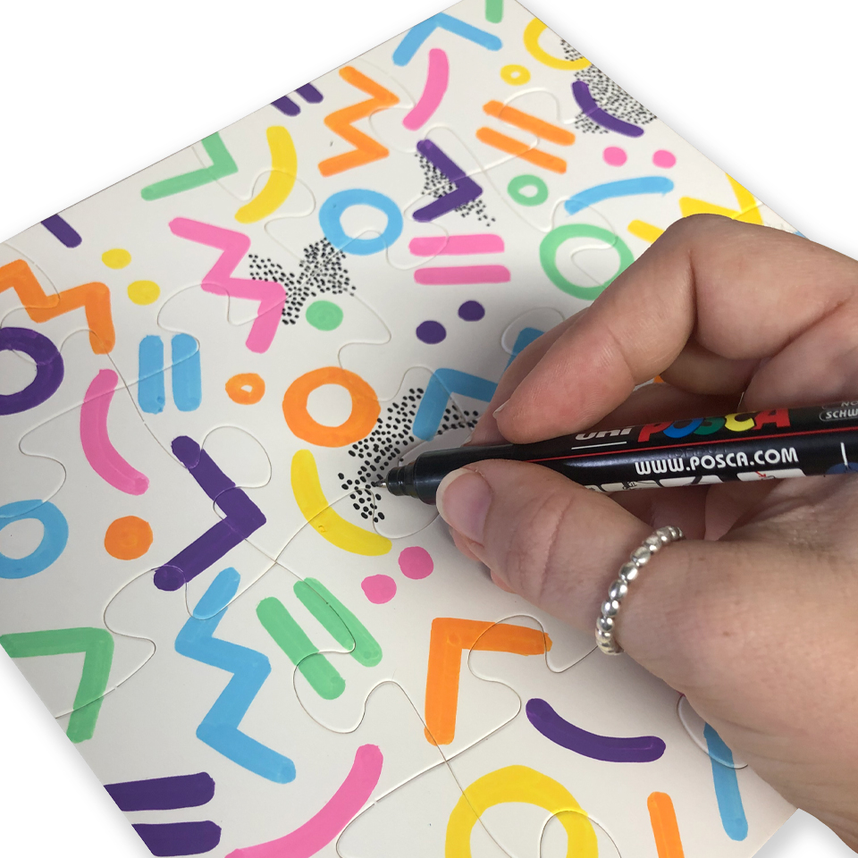 • Step 1Use a pencil to sketch out your design onto the jigdraw pieces. We have chosen to create a pattern using 6 different shapes, however you may like to do a picture or something else! Use POSCA markers to colour in your design.