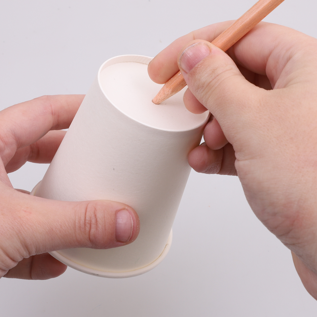 • Step 1Poke a hole in the bottom of a paper cup using a sharp pencil.