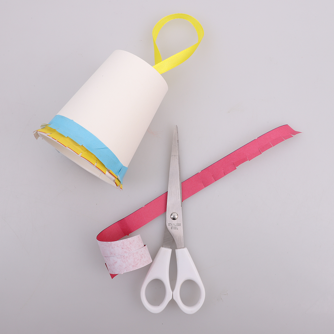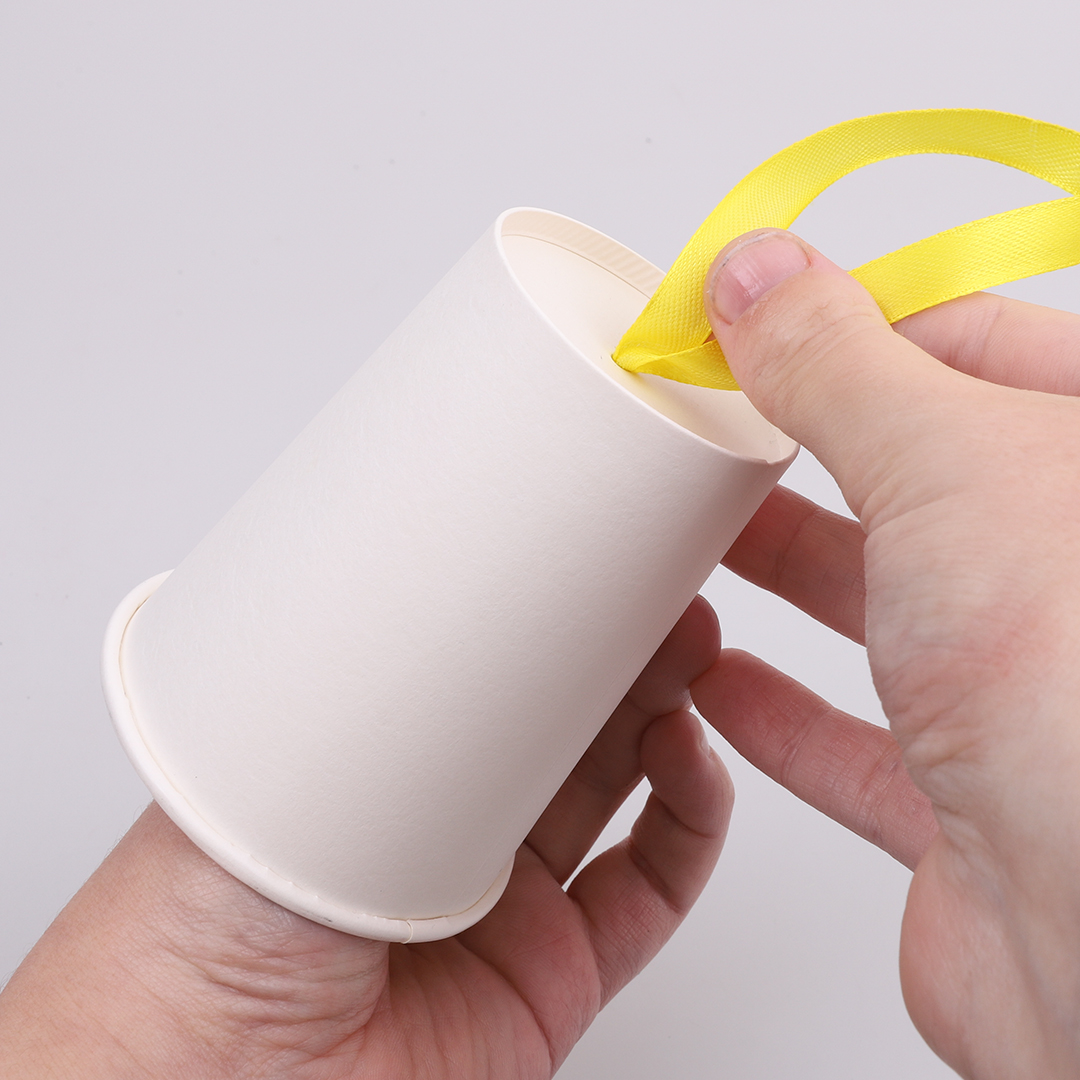 • Step 2Cut 20cm of satin ribbon and place both ends through the hole in the paper cup. Adult supervision is recommended when using scissors. Use sticky tape to secure the ribbon ends to the inside of the cup. This will create a loop for holding or hanging.