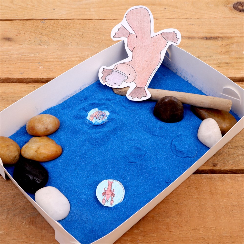 • Step 3Construct a sand art tray and tip in enough sand to cover the base of the tray. You don’t need to fill the tray completely, but a couple of centimetres will work nicely. You may even wish to add some pebbles or foraged sticks from the garden to create a more Platypus friendly environment. Always ensure you have permission before collecting anything from the local environment and adult supervision is recommended.