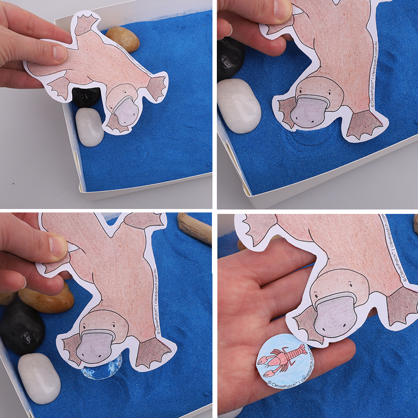 • Step 5Ask the “Platypus” to hold the cardboard Platypus and begin to move its bill over the surface of the sand. The magnet on the bill will be attracted to the buried food circles, imitating the sixth sense of a Platypus when it hunts. The “Platypus” will need to feel for the pull and use this to uncover the food!