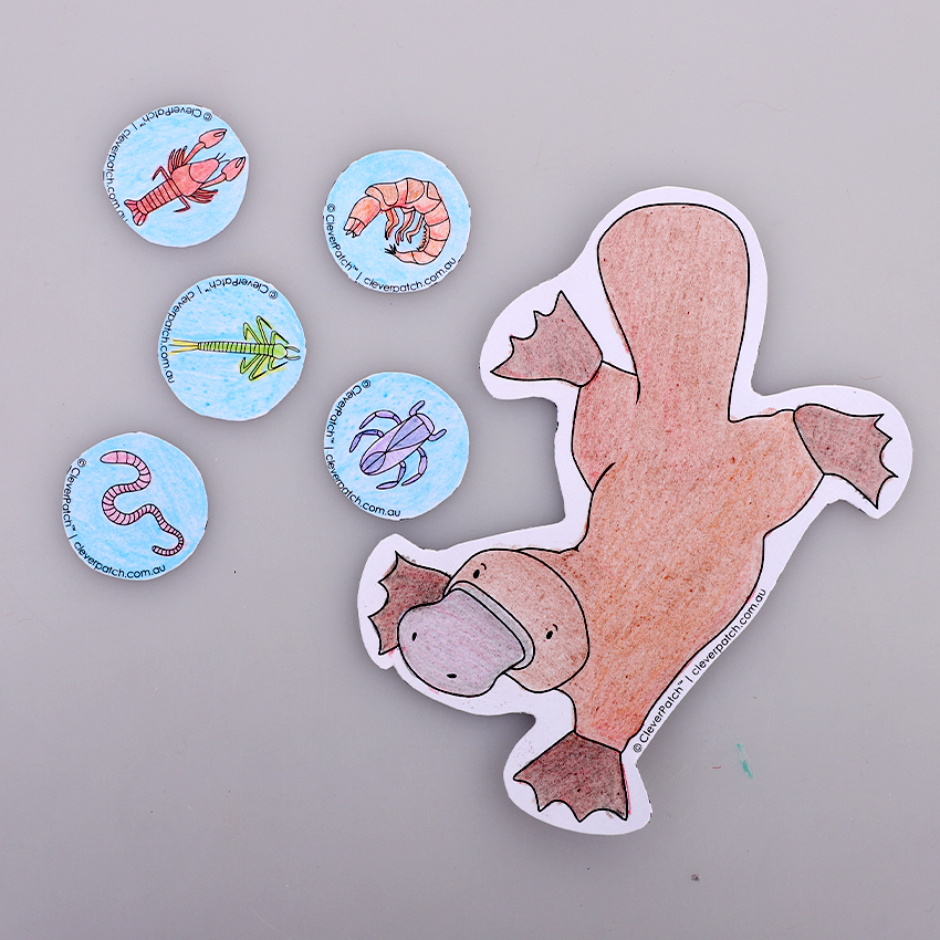 • Step 2Flip the template pieces over and glue a magnet onto the back of each of the food circles. Make sure the magnets are glued so the small indent circle is facing up on each of the template circles. Glue a magnet onto the Platypus’ bill, making sure the small indent circle is facing down. Allow to dry completely.