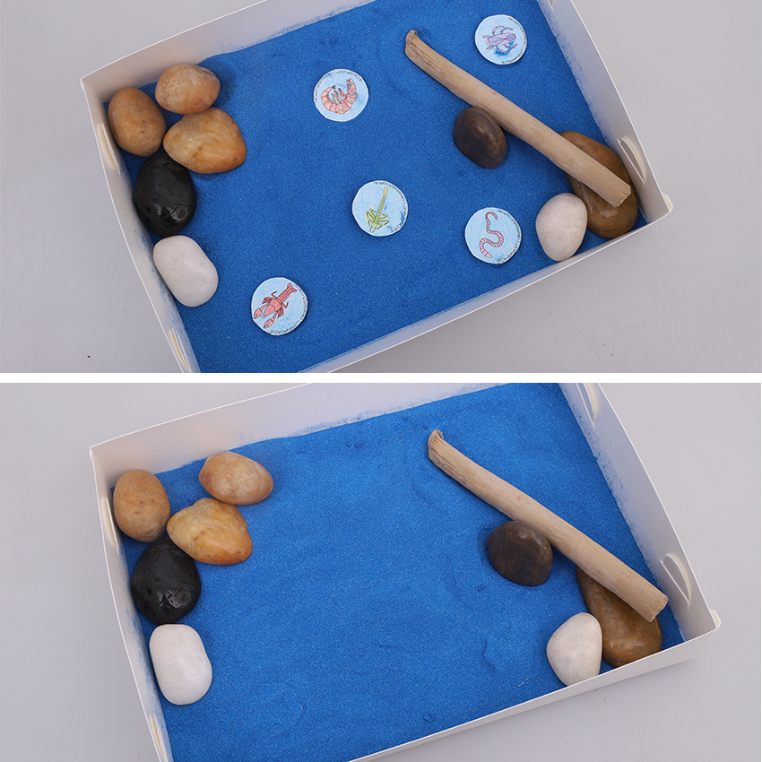 • Step 4. Your Platypus Electroreception Game is now ready to play! To begin the game, choose someone to be the “Platypus” and ask them to close their eyes. Place the food circle pieces into the sand art tray, positioning them wherever you like. Cover the pieces with a thin layer of sand so they are no longer visible but are not buried too deep in the sand.
