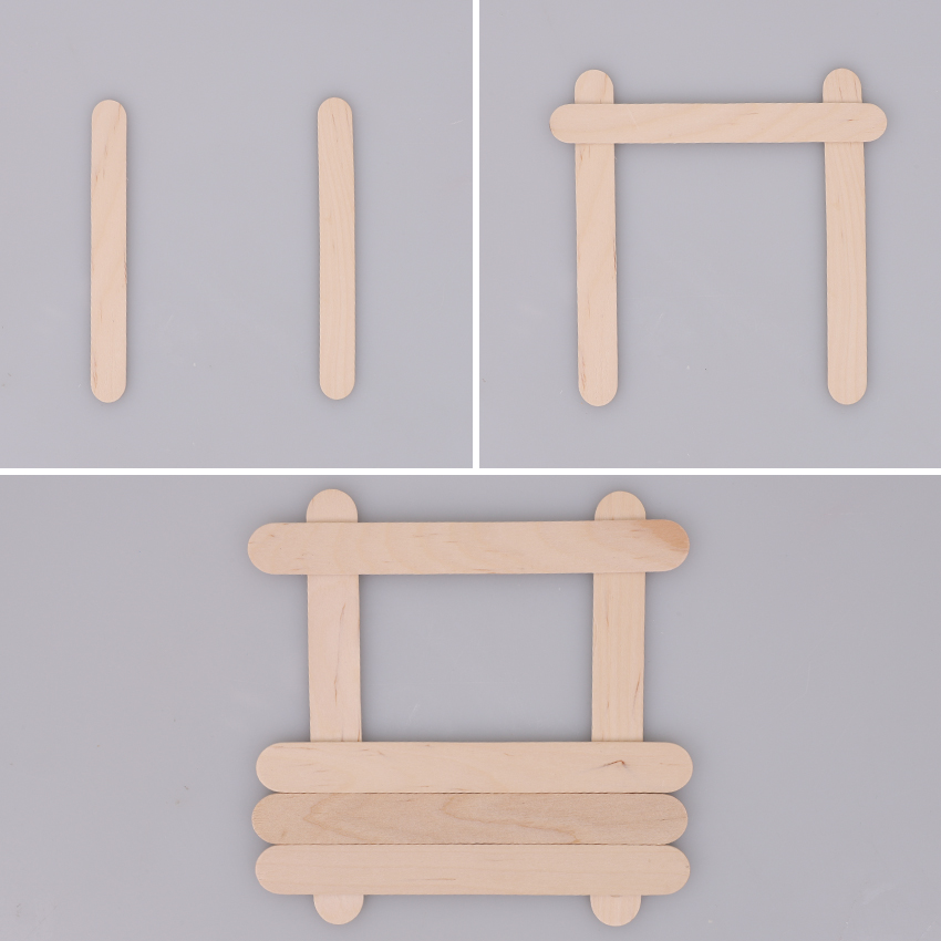 • Step 4Place two popsticks flat on your work surface as shown. Place another popstick horizontally across the top of the first two popsticks. Place three more popsticks next to each other horizontally along the bottom, as shown. Glue the popsticks in place and allow to dry.