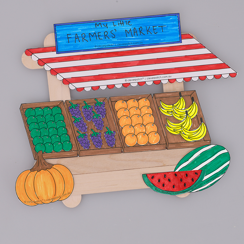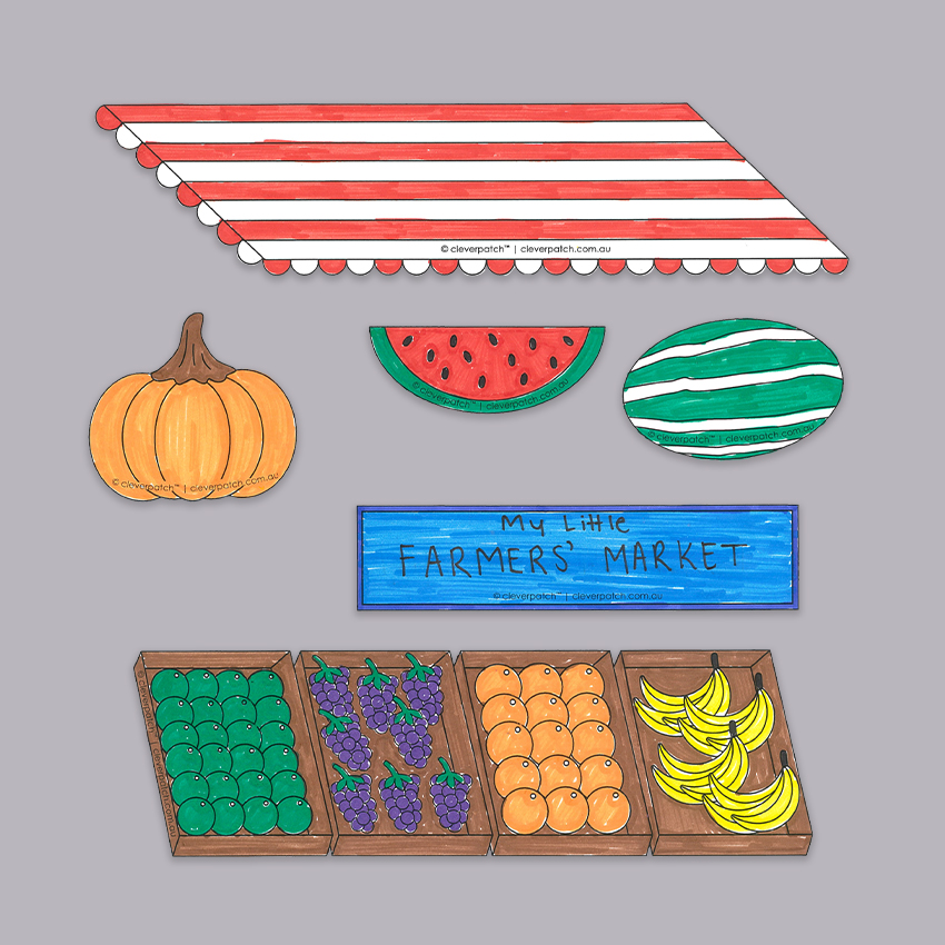 • Step 2Decorate your template pieces using markers and give your stall a name. You might like to draw your own fresh produce or market stall items using the empty boxes template.