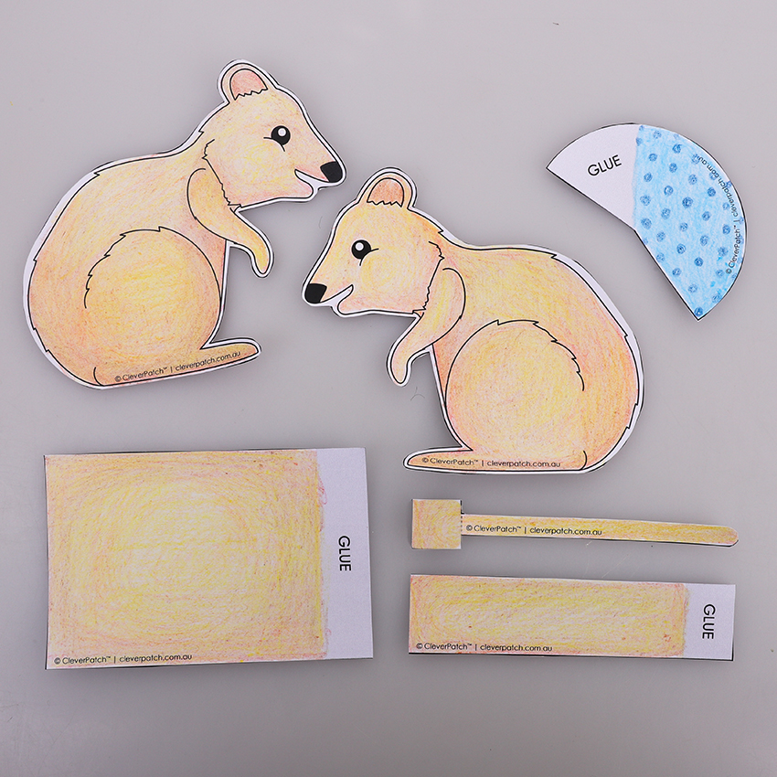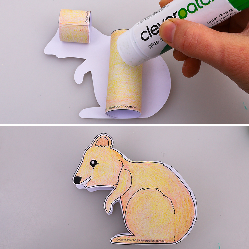 • Step 7Add glue to the front surface of the cylinders then position the second quokka piece on top, so that the cylinders are in-between. Make sure the quokka pieces are aligned and allow to dry.