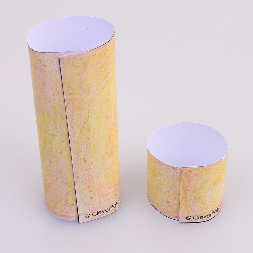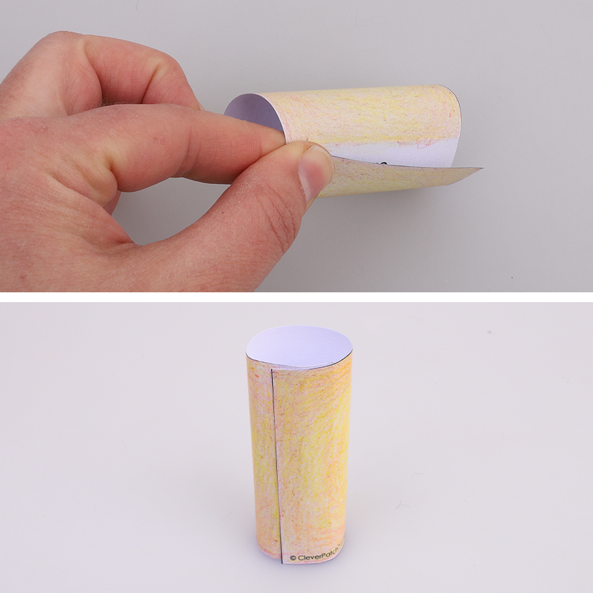 • Step 4Take the largest rectangle template piece and bring the short ends together to create a cylinder with open ends. Add glue to the tab as indicated and press the ends together to hold in place. Allow to dry.
