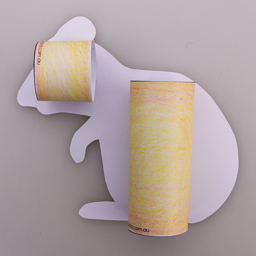 • Step 6Lay one of the quokka pieces with the design facing down on the surface in front of you. Place the large cylinder so it runs vertically down the middle of the quokka’s body and the small cylinder so it runs horizontally at the top of the quokka’s head as shown. Glue in place and allow to dry.