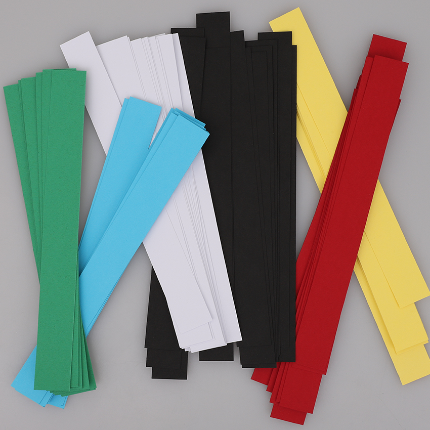 • Step 1Choose which colours you are going to use in your bracelet and take a sheet of cover paper for each. Use a ruler and pencil to mark each sheet with strips measuring 19 x 2cm then carefully cut the strips out. Adult supervision is recommended when using scissors.