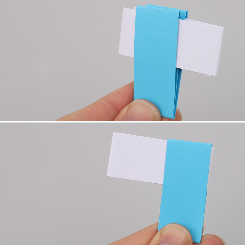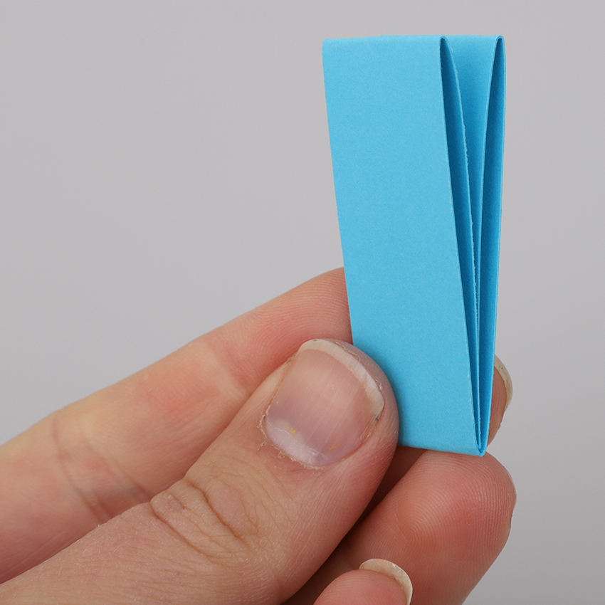 • Step 2Fold each strip in half, open it back out and then fold the ends into the centre crease. Fold the strip in half again so it looks as shown in the bottom image.