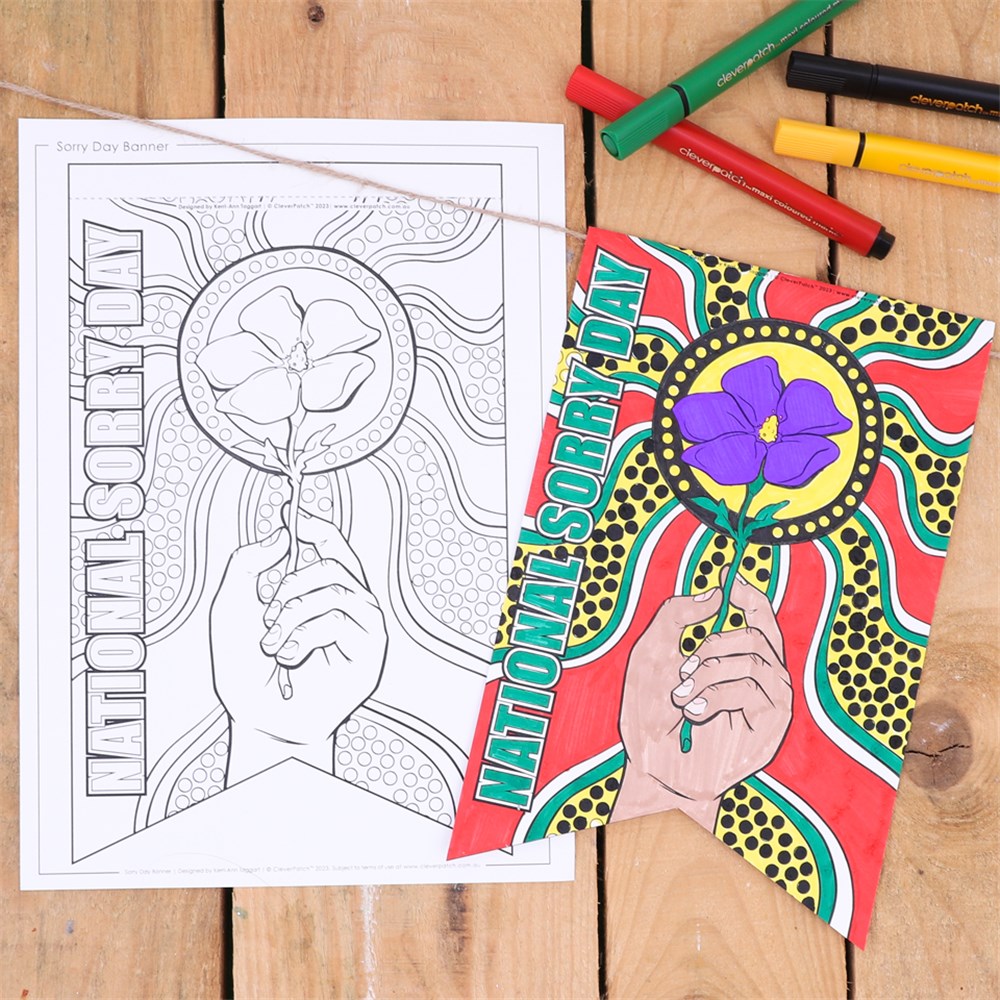 Commemorate National Sorry Day on the 26th of May with our Sorry Day Banner beautifully designed by Kerri-Ann Taggart (also known as KEZ), an Indigenous digital artist from the Wonnarua area (in the Hunter Valley, NSW).