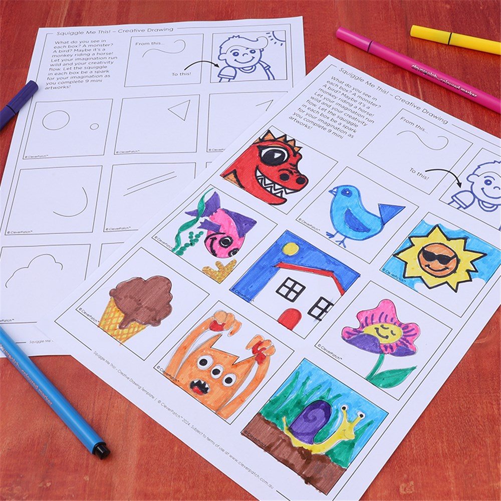 • Step 2Use the squiggle prompt in each of the squares as inspiration to create a mini artwork. You may like to start with a lead pencil to create an outline then colour in using markers or pencils.