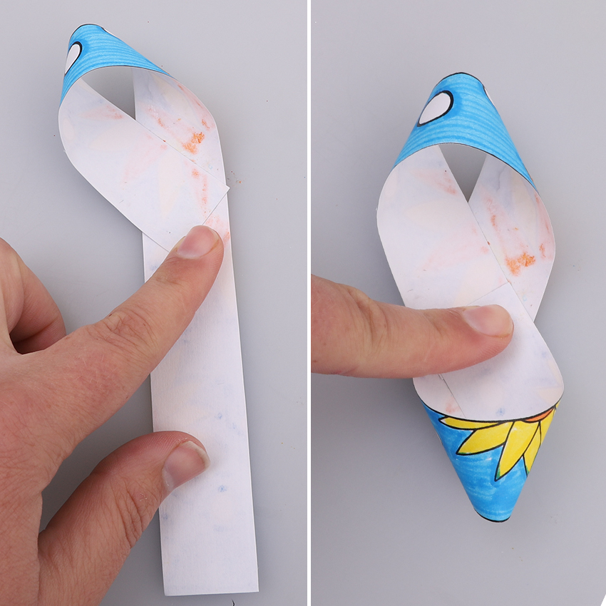 • Step 3Take one of the long strips and lay it on the desk with the design facing down. Bring one end around in a loop to the middle as shown Use glue to secure. Do the same thing with the other end but in the opposite direction to form a figure 8. Glue in place and allow to dry.