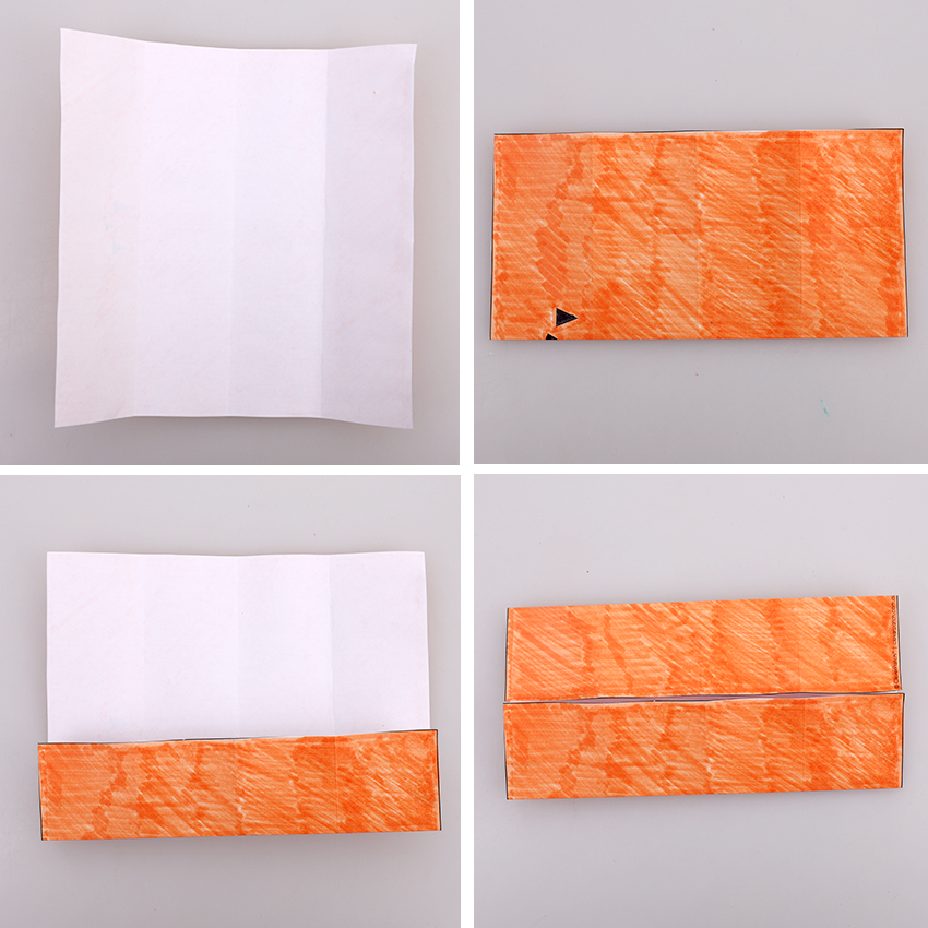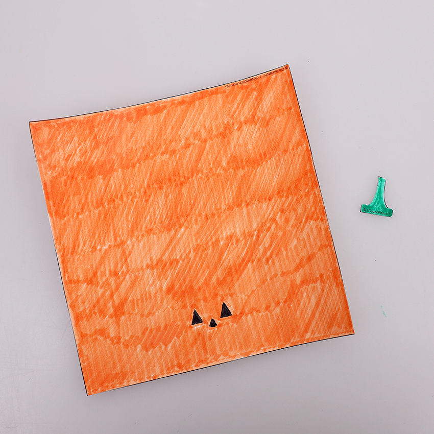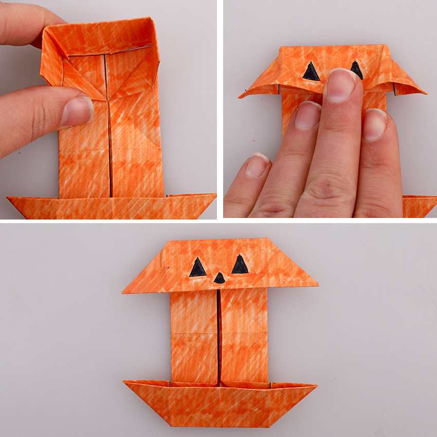 • Step 2Place the square design side down, making sure the jack-o’-lantern’s face is along the bottom edge. Fold the bottom edge up to the top, crease then unfold. Fold the bottom and top edges into the middle line you just created, crease then unfold. There will now be three horizontal creases.