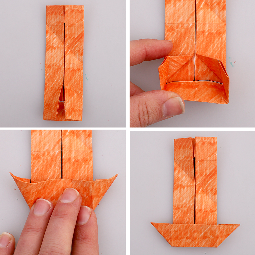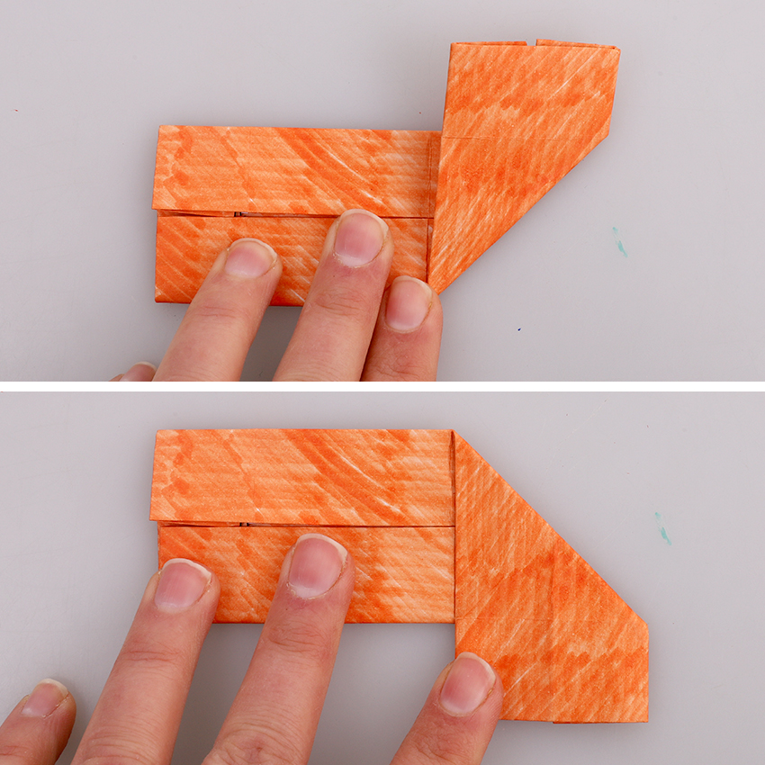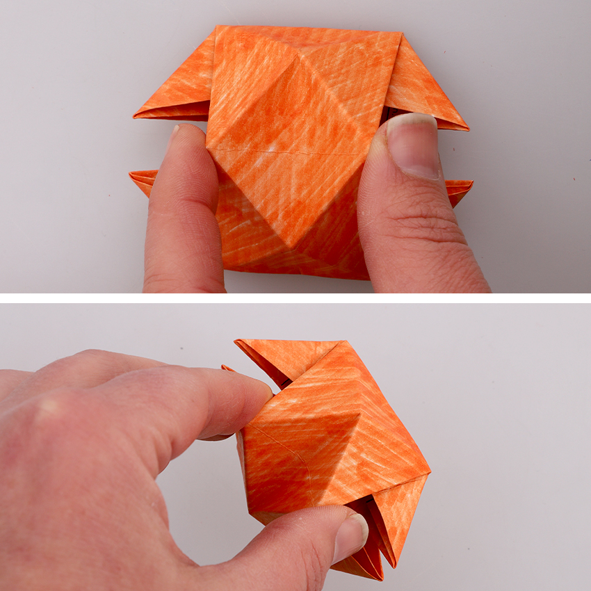 • Step 7Turn the paper 90 degrees so it is now running vertically with the face at the top. Open the bottom left and right flaps, pushing the bottom edge upwards and creasing to create an upside-down trapezium shape, as shown.