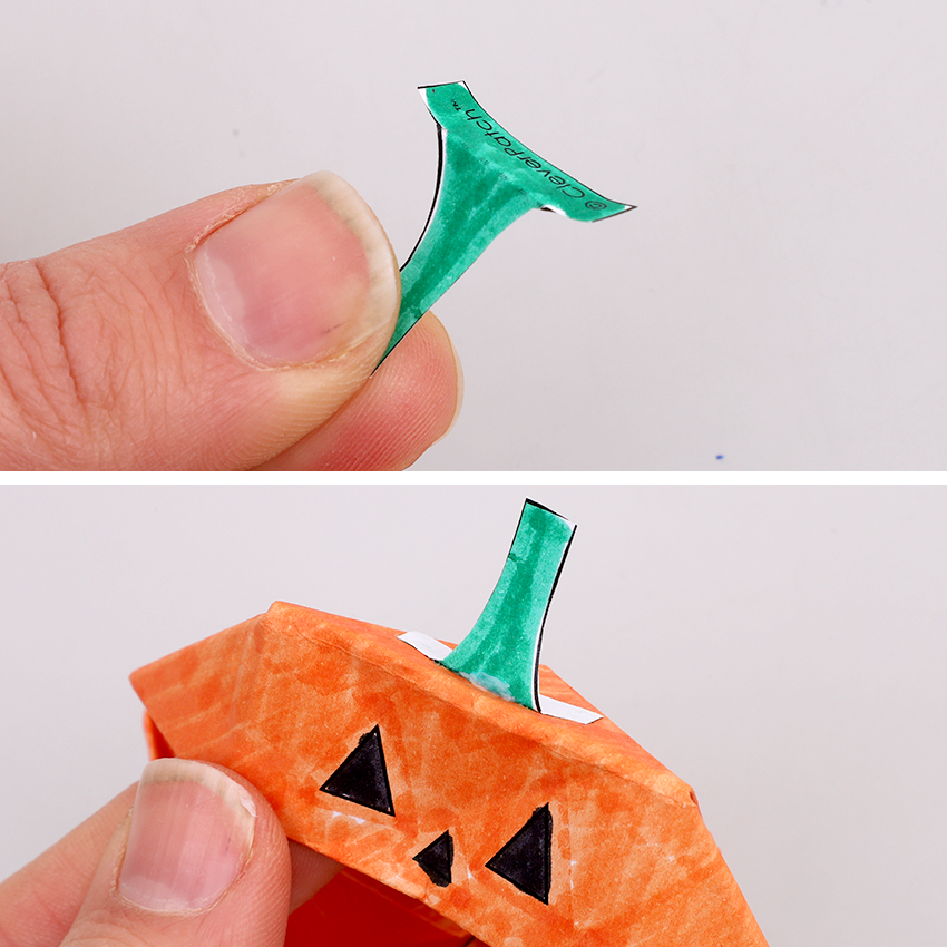 • Step 12Mountain fold along the dotted line on the stalk template piece and glue in place on top of the jack-o’-lantern’s head. Allow to dry.