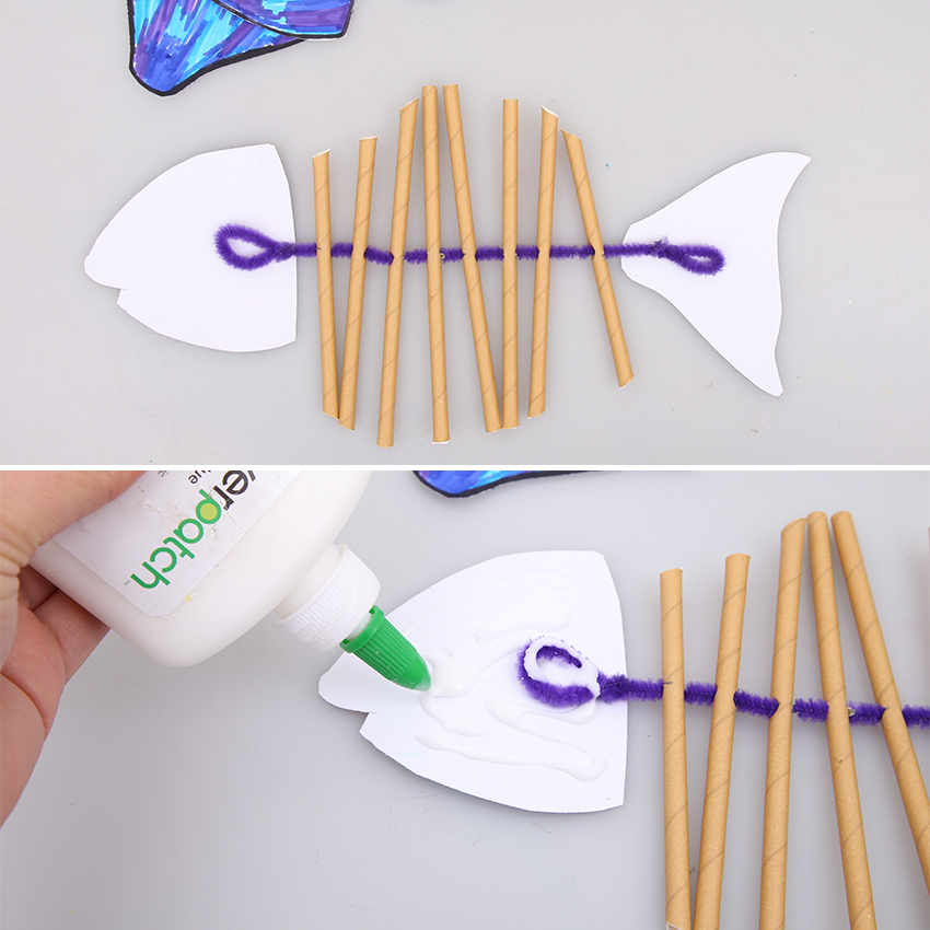 • Step 3Think about the type of fish you want to create, then cut the straws in an arc above and below the chenille stem to give the body of your fish some shape. Adult supervision is recommended when using scissors.