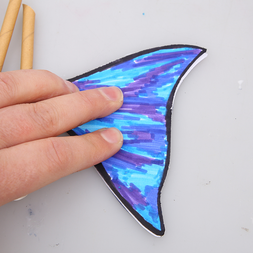 • Step 7Fold along the light grey dashed line on each fin. Take one of the fins and use glue to attach the small tab to one of the paper straws. Allow to dry then flip the fish over and attach the second fin in the same way. Allow to dry.
