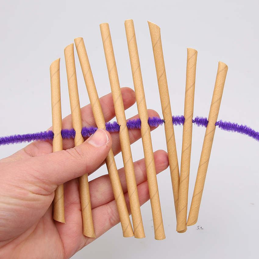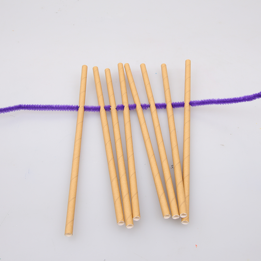 • Step 1Take 8 paper straws. Use a sharp pencil to carefully poke a hole through each one approximately 7cm from one of the ends.