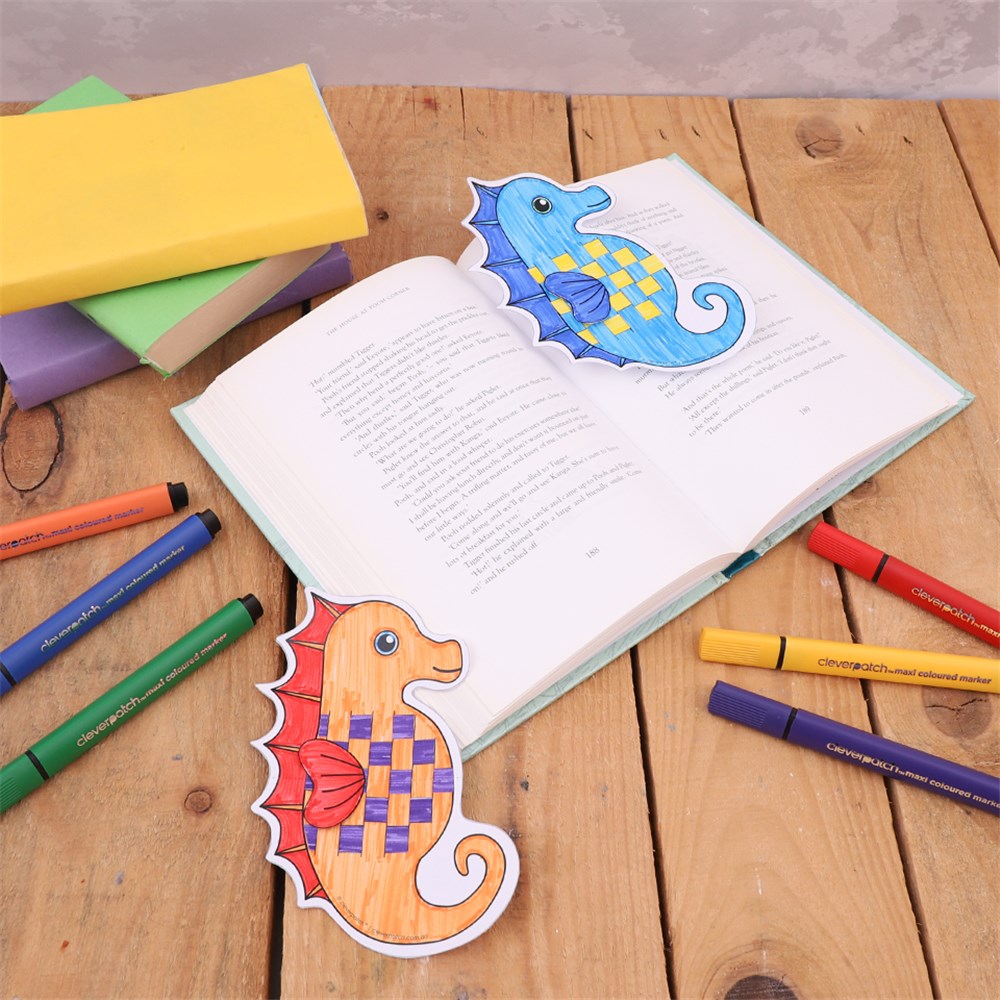 • Step 2Decorate your seahorse template pieces using markers or pencils. Use contrasting colours for the weaving strips and the body to make the woven pattern easier to see in your bookmark.