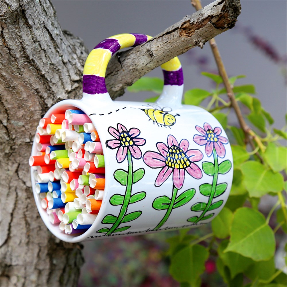• It’s best to hang your bee hotel in a sunny to slightly shaded position that is sheltered as the straws are not weather proof. Place the bee hotel above 1 metre off the ground, but no higher than 2 metres. Make sure it won't get too hot in summer. Don't forget to provide lots of bee friendly plants and water nearby so the bees enjoy their stay!