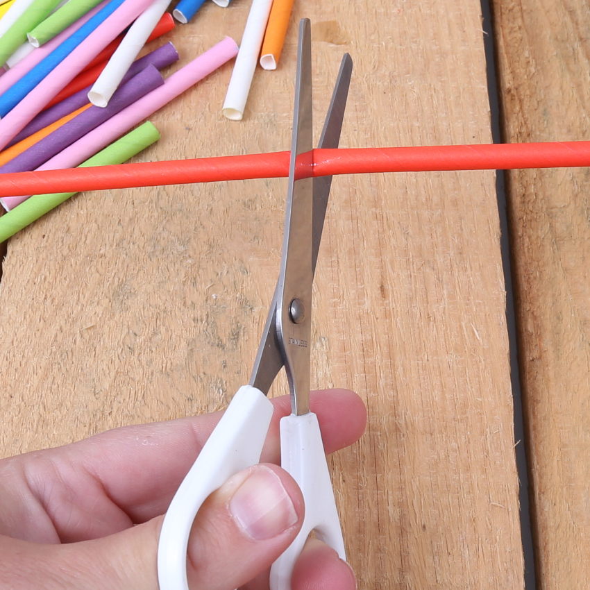 • Step 1Begin by cutting a paper straw into 2 lengths that fit nicely into the mug. There will be a small amount of straw to discard.