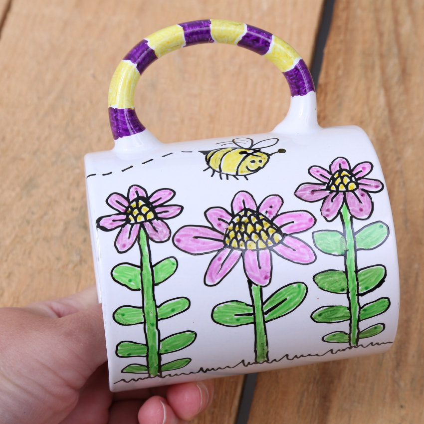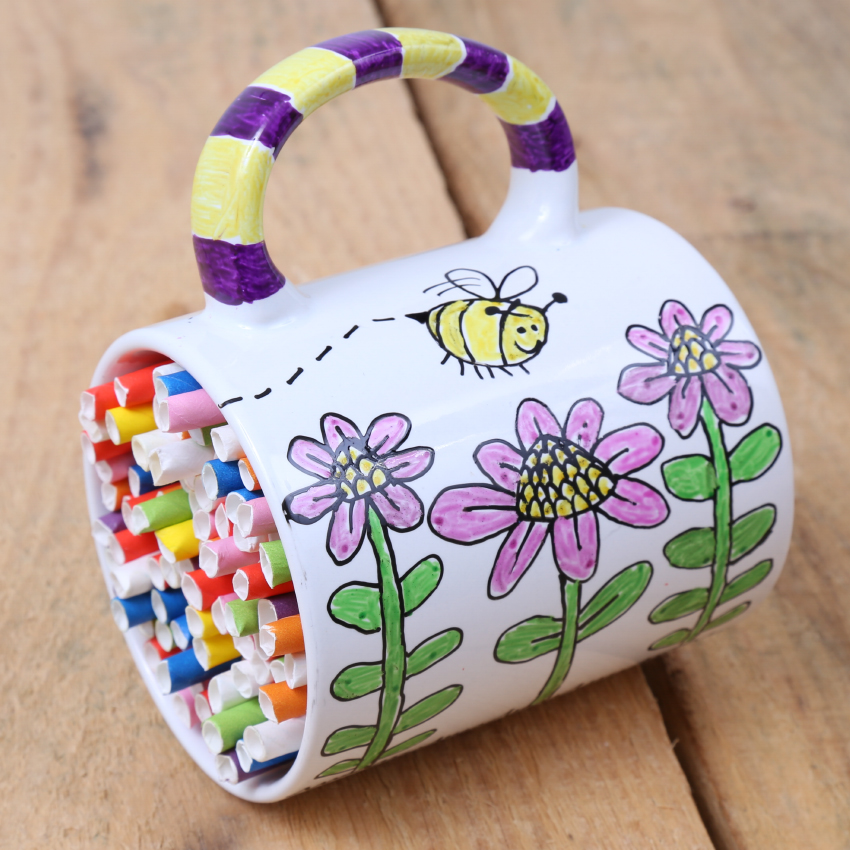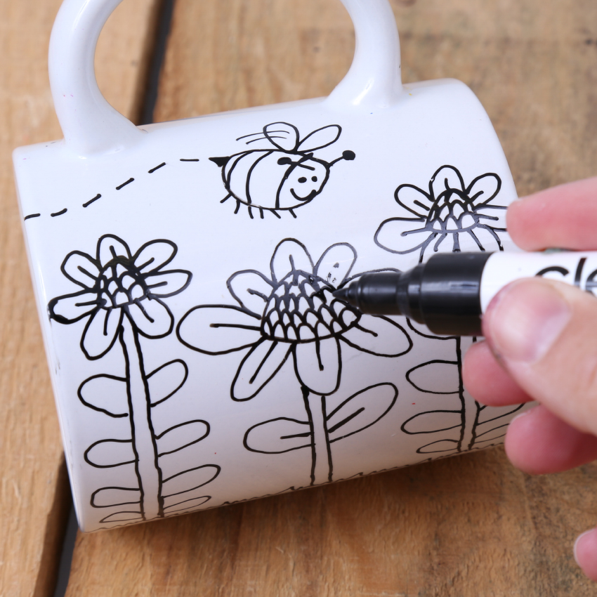 • Step 3Use a fine tip Glass & Porcelain Marker to draw the outline of a garden scene onto the side of the mug. Remember the mug will be hanging from its handle, so make sure your picture will be facing the correct way. Don’t forget to decorate both sides! Allow the marker to dry.